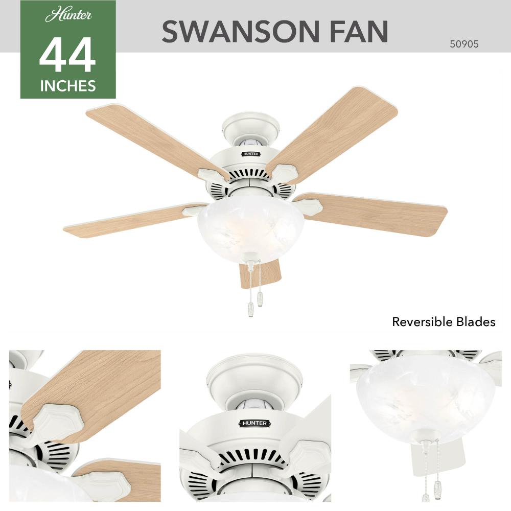 The Swanson casual ceiling fan features easy-to-use pull chains and an LED light. As a part of the Professional Series, the Swanson Collection is available in a variety of sizes, finishes, and light kit combinations. You can add this Hunter ceiling fan to every room in your home knowing it?s wobble free, whisper quiet, and long lasting.