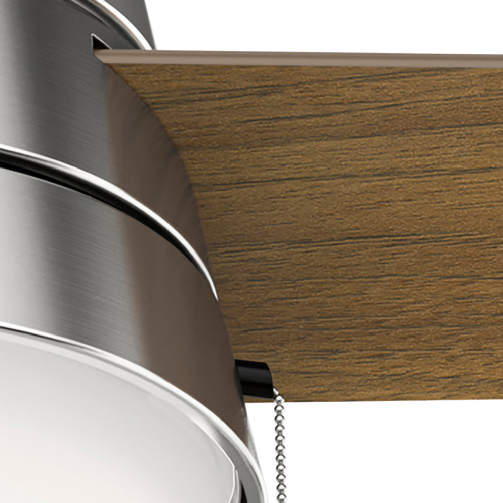 Soft lines and a Scandinavian modern inspired form give the Aker modern ceiling fan a transitional look that makes it versatile. The tonal blade side fits modern style rooms, while the reversible wood tone blade side softens the look for casual or modern farmhouse style rooms. Use the included pull chains to control this large ceiling fan with LED light. Shop the various sizes and finishes of the Aker Collection to create a cohesive look throughout your home.