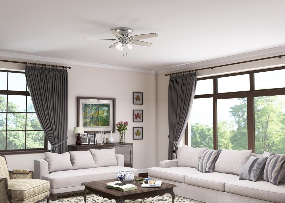 With a 52-inch blade span and low-profile design, the casual, traditional style of the Builder Low Profile will complement large rooms in your home without overpowering them. A mainstay in the Hunter? product line, this low-profile ceiling fan with lights features three-speed WhisperWind? motor technology to deliver quiet and ultra-powerful performance.