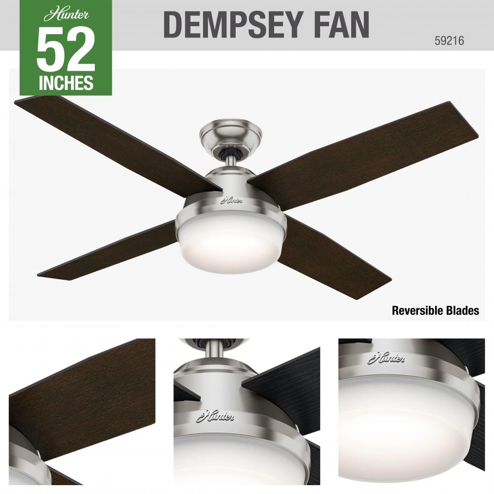 A contemporary fan with mass appeal, the Dempsey will fit flawlessly in your home's modern interior design. The beautiful, clean finish options work together with the high contrast of angles throughout the design to create a look that will keep your space looking current and inspired. Fully-dimmable, high-efficient LED bulbs give you total control over your lighting while the 52-inch blade span keeps the large rooms in your home feeling cool. We have a full collection of Dempsey fans so you can keep a consistent look while tailoring the size and features to each room in your house.