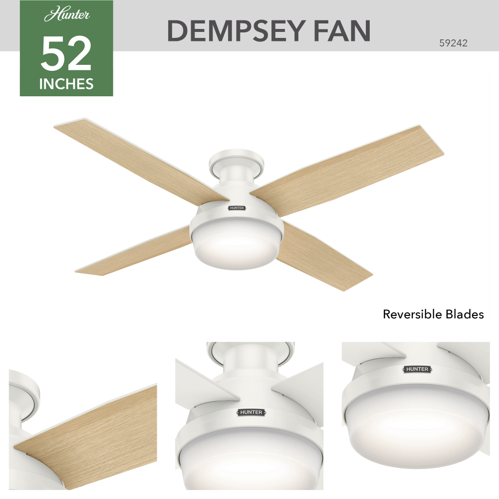 A contemporary fan with mass appeal, the Dempsey will fit flawlessly in your home's modern interior design. The beautiful, clean finish options work together with the high contrast of angles throughout the design to create a look that will keep your space looking current and inspired. Fully dimmable, high-efficient LED bulbs give you total control over your lighting while the 52-inch blade span keeps the large rooms in your home feeling cool. We have a full collection of Dempsey fans so you can keep a consistent look while tailoring the size and features to each room in your house.