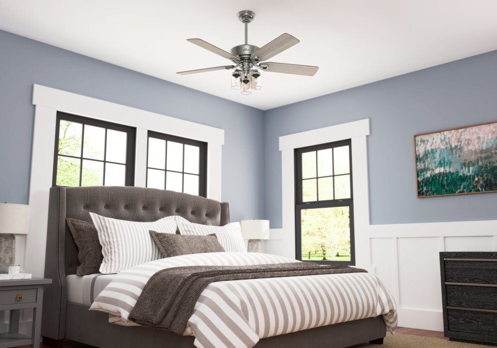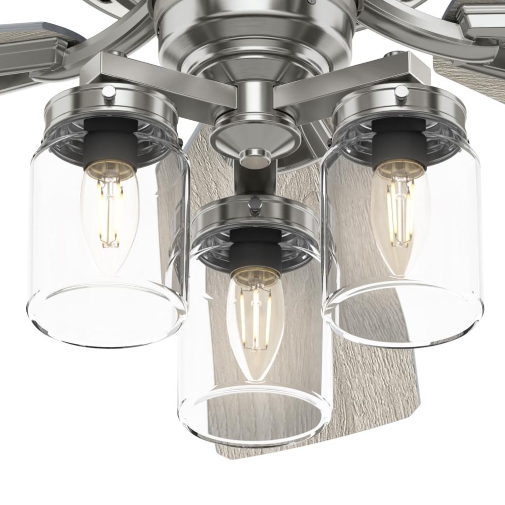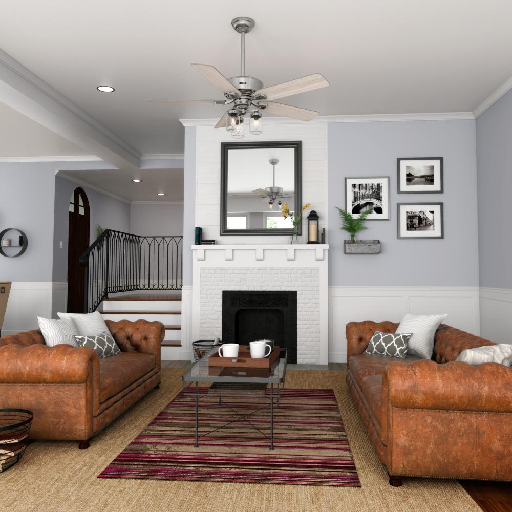 With rustic wood blades and mason jar-inspired light glass, the Devon Park indoor ceiling fan creates an air of nostalgia in your home. The Onyx Bengal finish complements darker fixtures in farmhouse decor while the Brushed Nickel finish works well with coastal-inspired rooms. This ceiling fan keeps large rooms like living rooms, bedrooms, and kitchens cool with Hunter’s WhisperWind® motor technology that delivers powerful air movement with whisper-quiet performance.