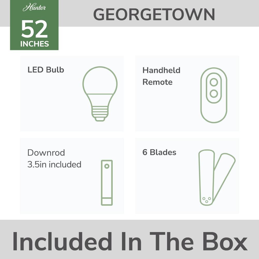 Be the talk of the town with the Georgetown ENERGY STAR® ceiling fan, designed for large rooms with a modern touch. Perfect for indoor use, it features a 6-speed DC motor, delivering superior energy efficiency—64% more efficient*. Control your comfort with ease using the included remote. Hunter’s ENERGY STAR® certified ceiling fans provide top-notch performance and sleek style, making your home more comfortable and eco-friendly. Plus, HunterExpress® fans are created for easy 1-2-3 installation with a pre-assembled body, plug & play wiring, and easy-install blades.