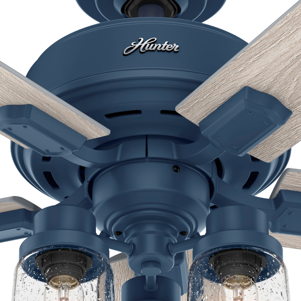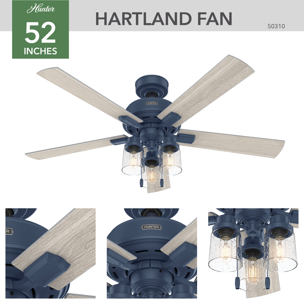 The Hartland chandelier-inspired ceiling fan has a revised classic look that looks beautiful in casual, indoor spaces. The clear seeded glass and included Edison LED light bulbs create a stunning look. Add a subtle pop of color with the Indigo Blue fan or complement other fixtures and accents in your farmhouse-style room with the Noble Bronze or Matte Silver finish. Create a cohesive look in your space by pairing the Hartland ceiling fan with the coordinating light fixtures in its collection.