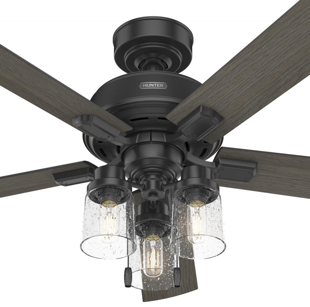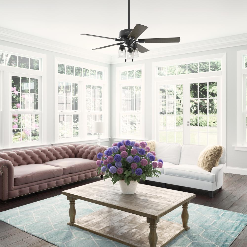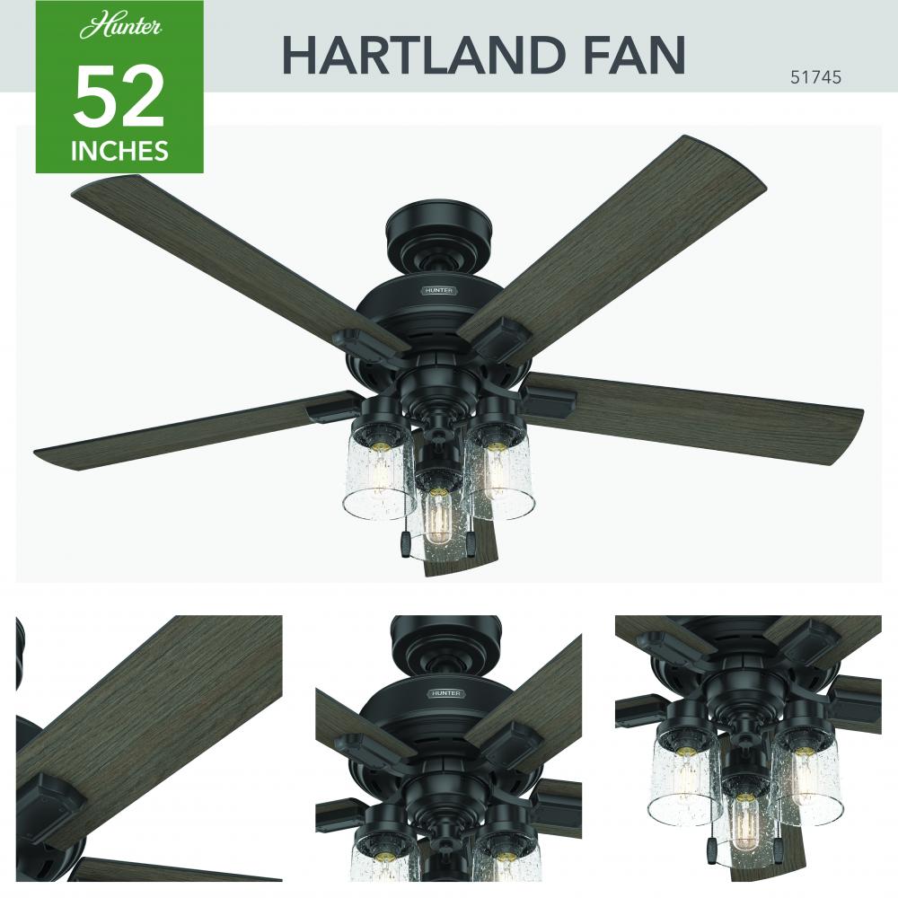 The Hartland chandelier-inspired ceiling fan has a revised classic look that looks beautiful in casual, indoor spaces. The clear seeded glass and included Edison LED light bulbs create a stunning look. Add a subtle pop of color with the Indigo Blue fan or complement other fixtures and accents in your farmhouse-style room with the Noble Bronze or Matte Silver finish. Create a cohesive look in your space by pairing the Hartland ceiling fan with the coordinating light fixtures in its collection.
