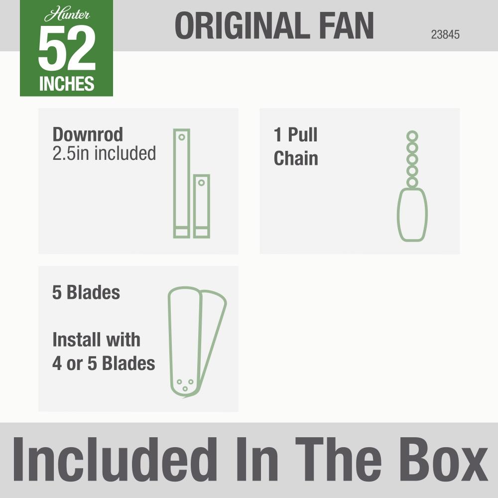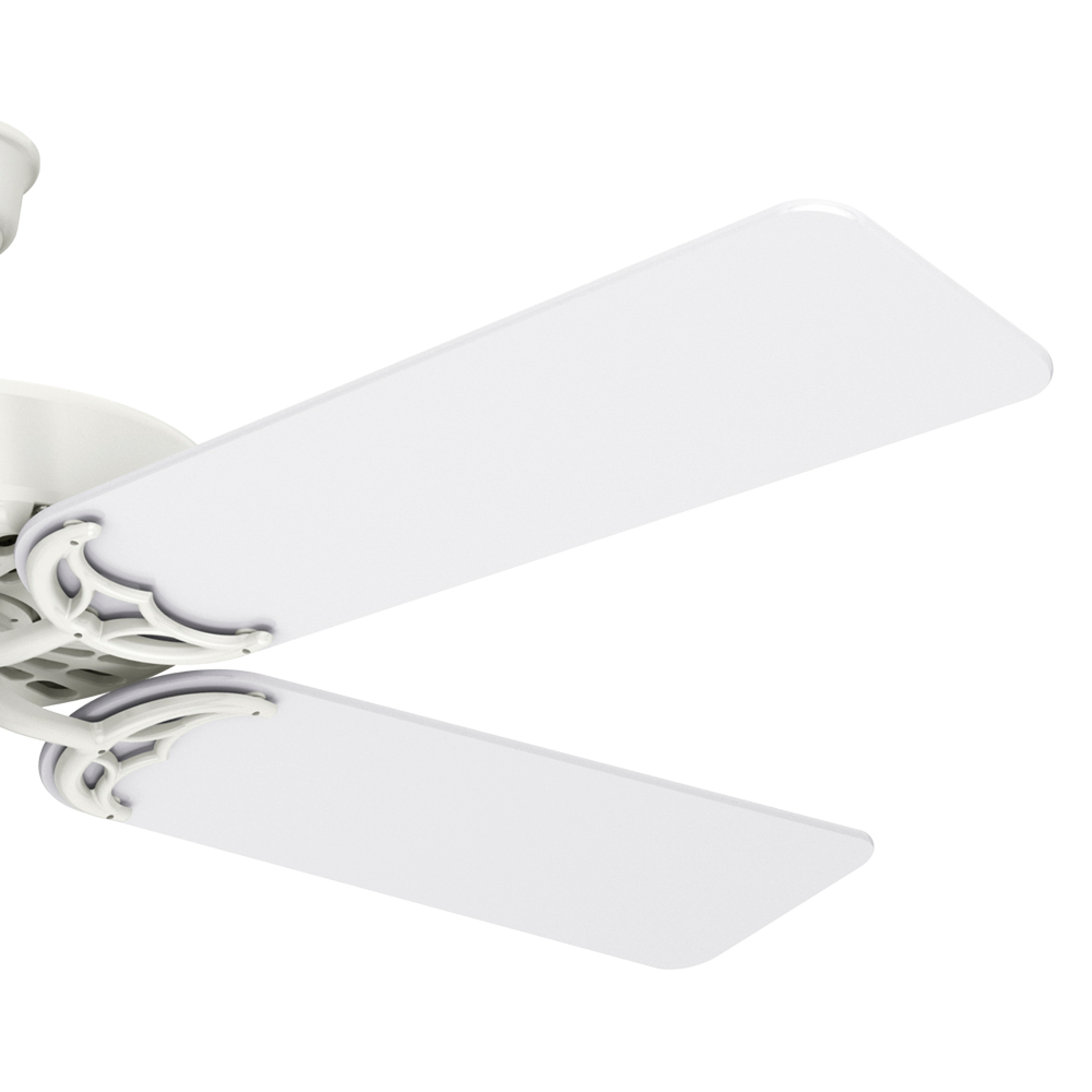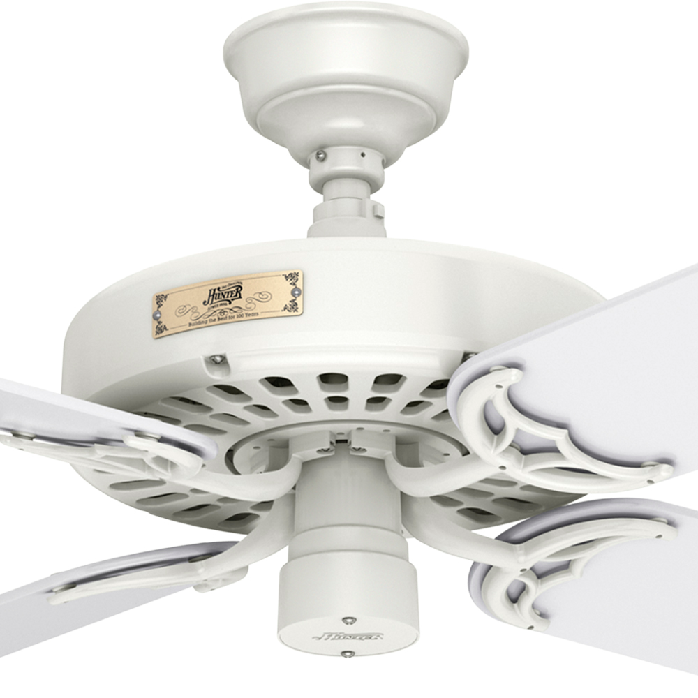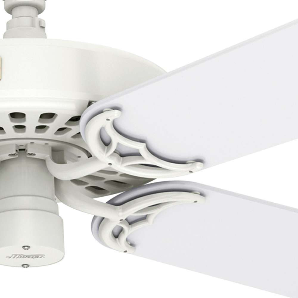 Proudly displayed in homes for decades, the one-of-a-kind Hunter Outdoor Original? White Blades 52-inch ceiling fan continues to deliver superior performance and years of endurance. The powerful motor features a cast-iron housing and a unique oil bath system that continually lubricates bearings, virtually eliminating noise and wear. A timeless addition to any room or covered space exposed to moisture and humidity, this fan is arguably one of our best outdoor ceiling fans.