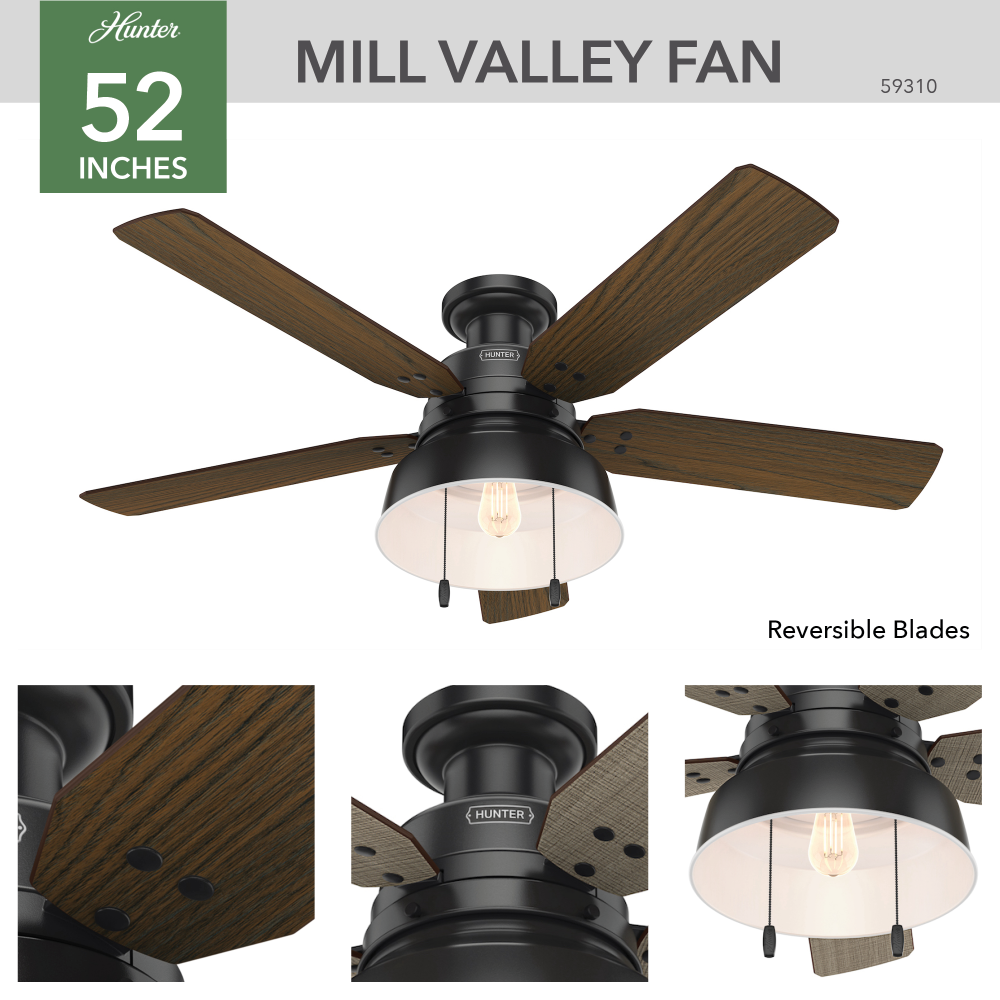 Industrial and rustic design come together on the Mill Valley low-profile ceiling fan with details including the vintage-looking rivets securing the blades, coin-edge thumbscrews, and barn-style open hood light. Style meets performance with the Mill Valley?s white hood reflector that maximizes light from a vintage-style energy-efficient LED Edison bulb. Perfect for areas exposed to moisture and humidity, this damp-rated fan completes the look of casual farmhouse living spaces or patios with low ceilings. The Mill Valley Collection is available in a variety of finishes and mounting options to customize the look of your room's rustic home decor while maintaining a consistent style throughout your home.