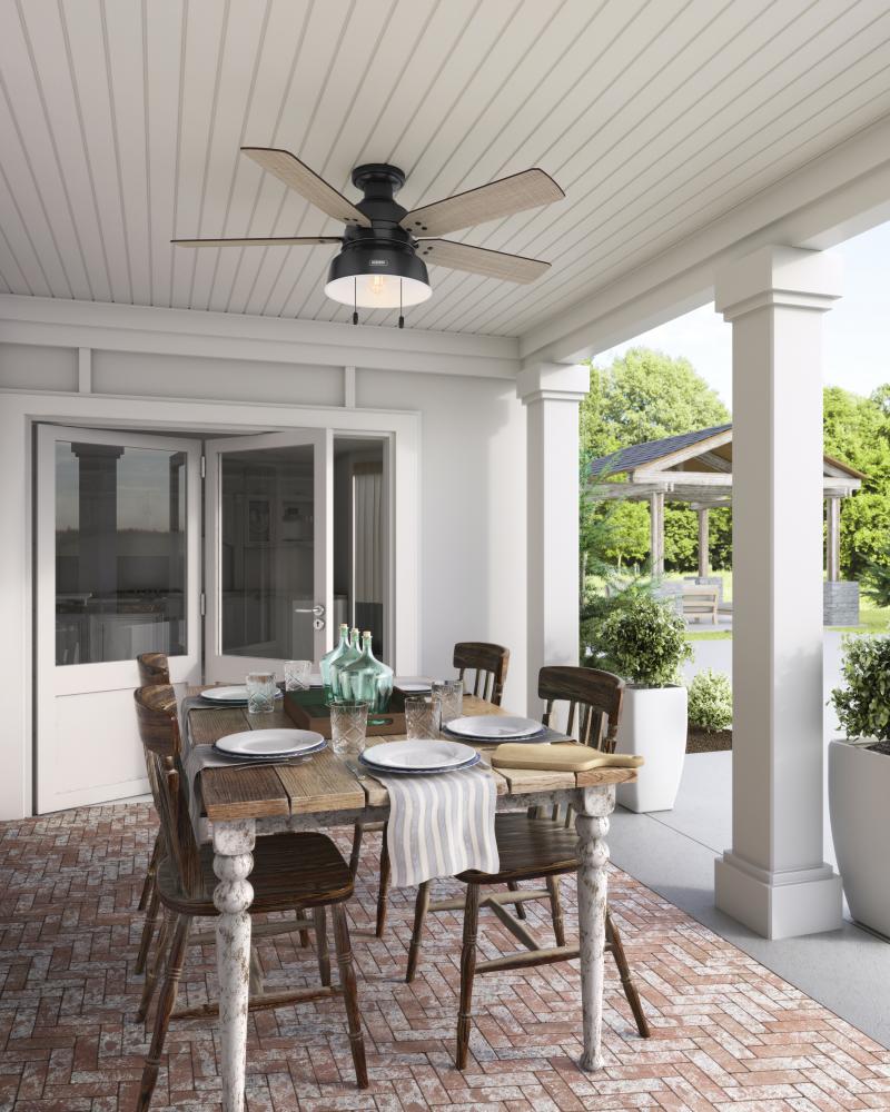 Industrial and rustic design come together on the Mill Valley low-profile ceiling fan with details including the vintage-looking rivets securing the blades, coin-edge thumbscrews, and barn-style open hood light. Style meets performance with the Mill Valley’s white hood reflector that maximizes light from a vintage-style energy-efficient LED Edison bulb. Perfect for areas exposed to moisture and humidity, this damp-rated fan completes the look of casual farmhouse living spaces or patios with low ceilings. The Mill Valley Collection is available in a variety of finishes and mounting options to customize the look of your room's rustic home decor while maintaining a consistent style throughout your home.