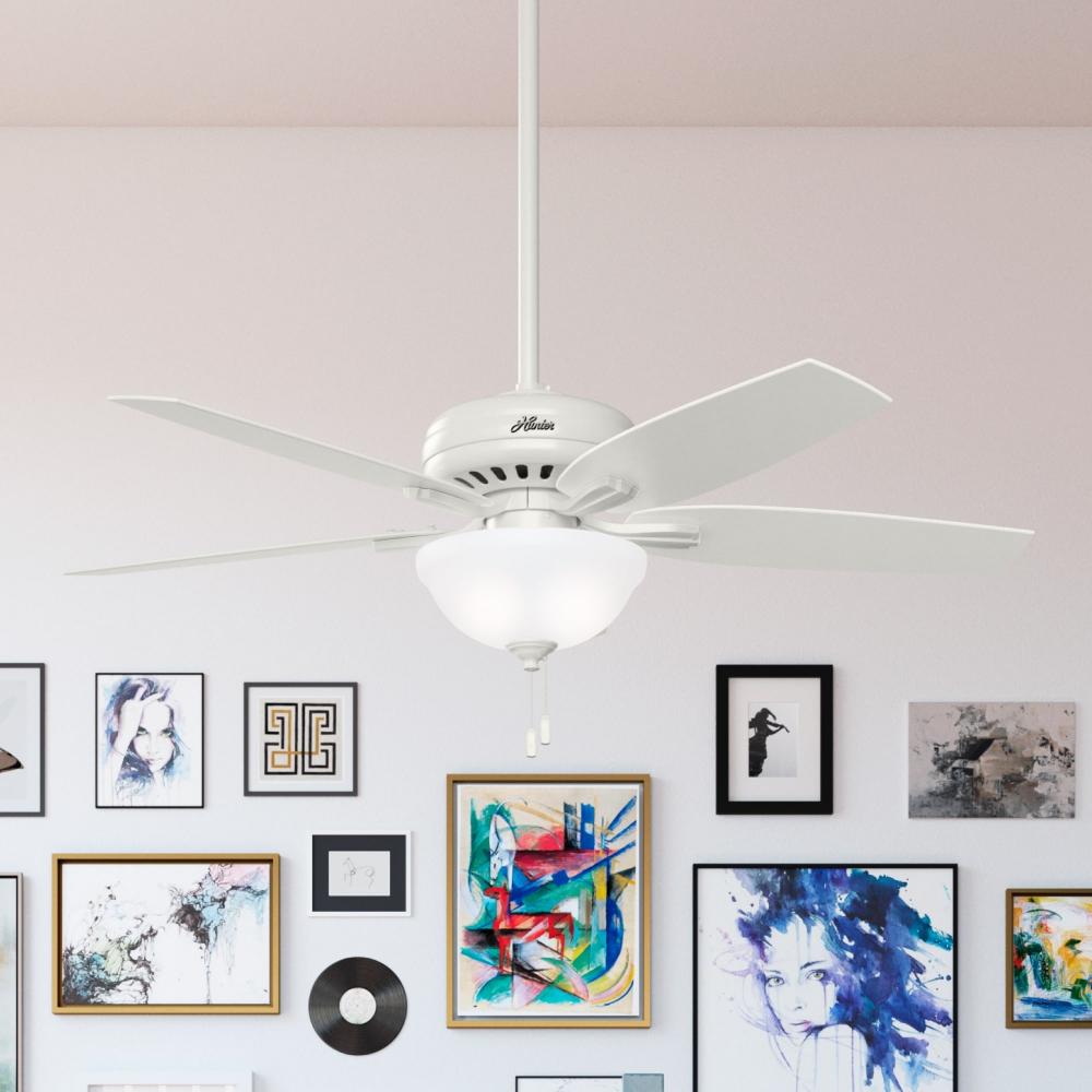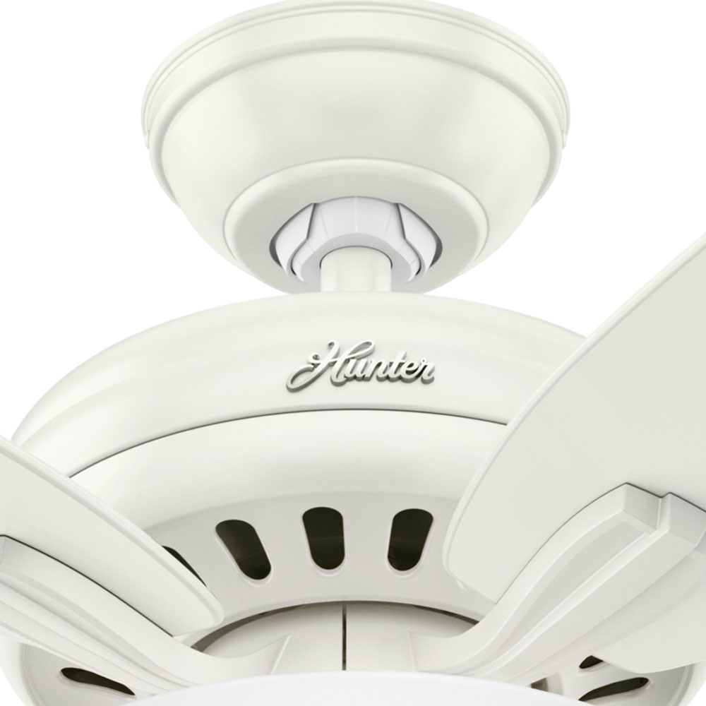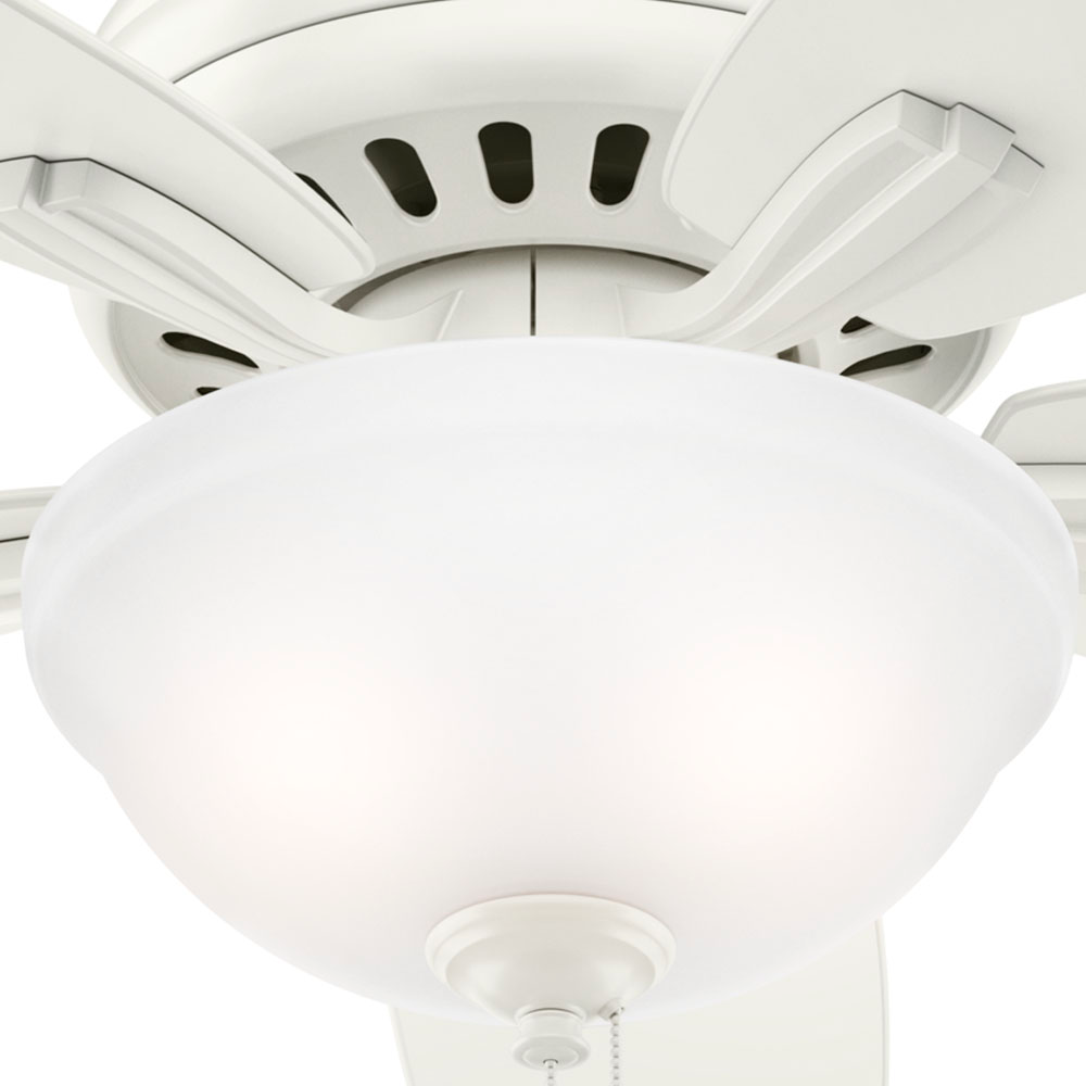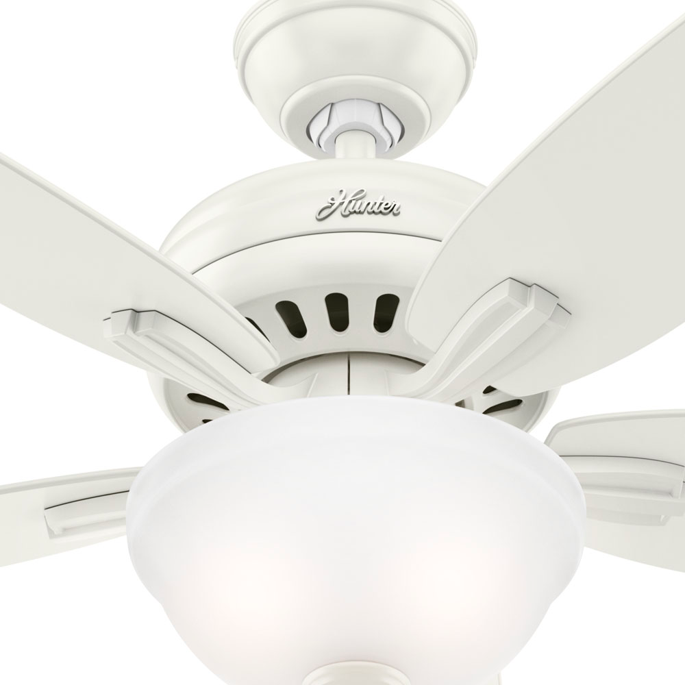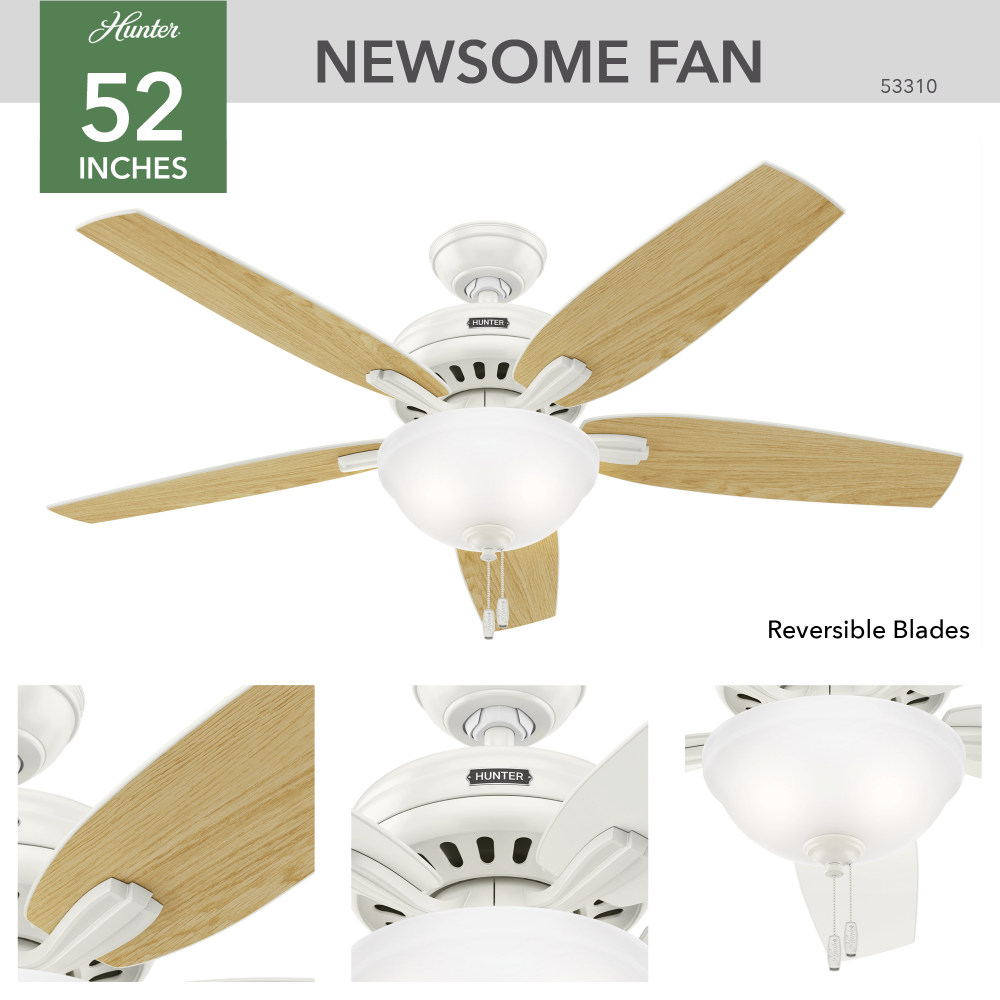 With its charming appearance, the Newsome traditional ceiling fan with light will complement your casual design style. The clean line details throughout the fan body and blade irons work together to create a coherent design that will fit any standard or large room space. The handsome bowl light fixture provides your ideal ambiance while the 52-inch blades are powered by a three-speed WhisperWind? motor delivering superior air movement and whisper-quiet performance so you get all the cooling power you want without the noise. The Newsome Collection offers you the freedom to choose from many different sizes, light kits, and other options to maintain a consistent look throughout every room in your home.