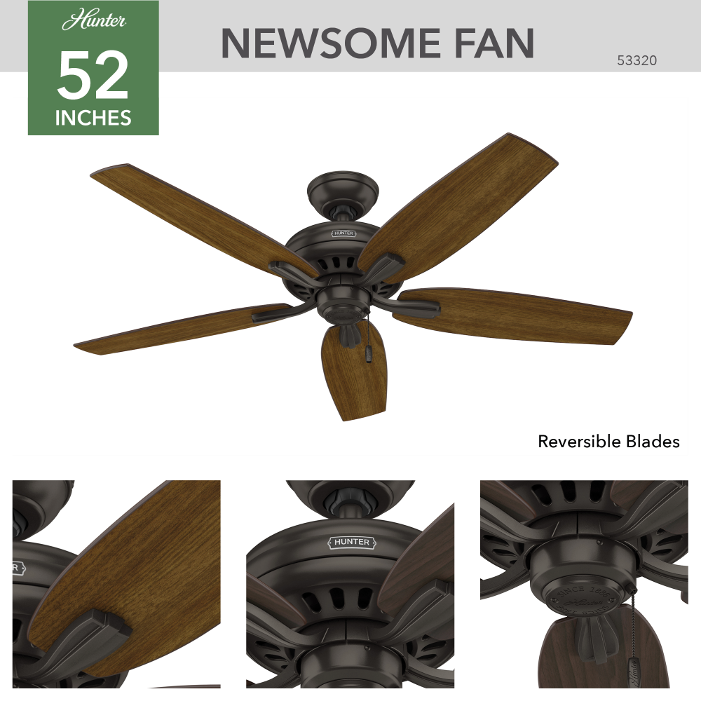 With its charming appearance, the Newsome traditional ceiling fan without light will complement your casual design style. The clean line details throughout the fan body and blade irons work together to create a coherent design that will fit any standard or large room space. The 52-inch blades are powered by a three-speed WhisperWind? motor delivering superior air movement and whisper-quiet performance so you get all the cooling power you want without the noise. The Newsome Collection offers you the freedom to choose from many different sizes, light kits, and other options to maintain a consistent look throughout every room in your home.