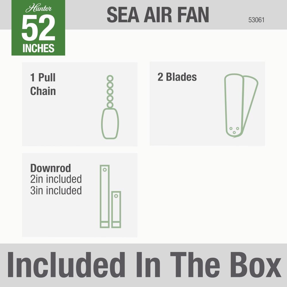 The Sea Air's traditional design and various color options will complement any large area in or outside your home. Made with stainless steel hardware to resist rust, this wet-rated fan is perfect spaces exposed directly to weather like patios and pergolas. The 52-inch blades of this outdoor ceiling fan are powered by a reversible, three-speed WhisperWind? motor delivering ultra-powerful air movement with a whisper-quiet performance so you get the cooling power you want without the noise. Be sure to check out the wet-rated accessory light kits Hunter? has to offer.
