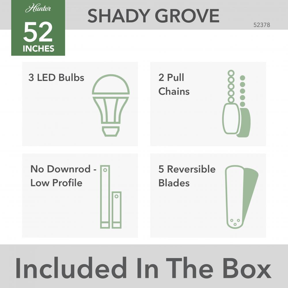 Add some contemporary style to your bedroom with the Shady Grove ceiling fan. The casual, transitional style features blades and a light kit in multiple finishes. An energy-efficient LED bulb included in the three lights can be installed in any fixture setting. The technology of our reversible, 3-speed WhisperWind® motor delivers ultra-powerful air movement with whisper-quiet performance so you get the cooling power you want without the noise you don’t™.