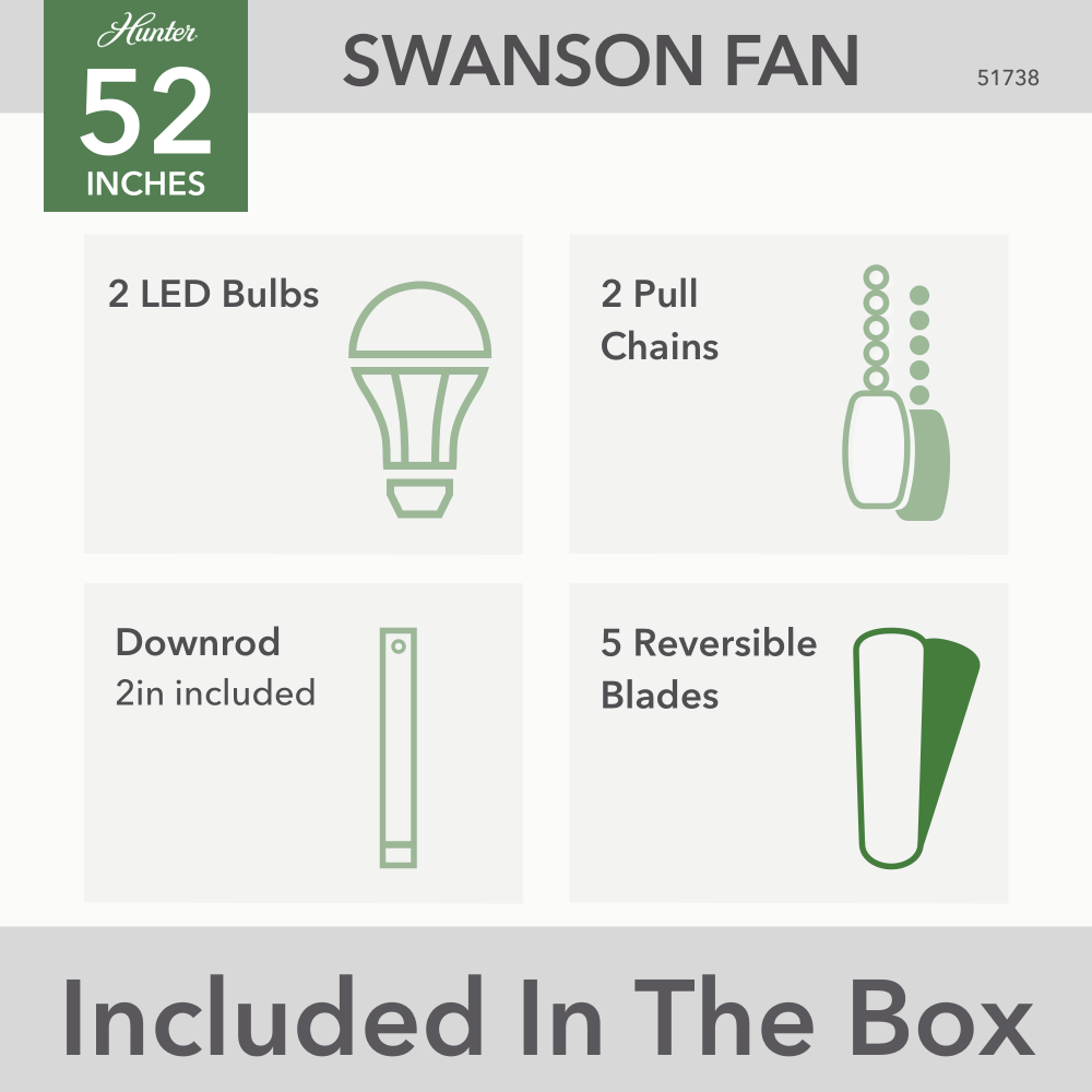 The 52-inch Swanson ceiling fan features easy-to-use pull chains and energy efficient LED light.You can install this Hunter fan to every room in your home knowing it’s wobble free, whisper quiet, and long lasting. As a part of the Professional Series, the Swanson Collection is available in a variety of sizes, finishes, and light kit combinations.