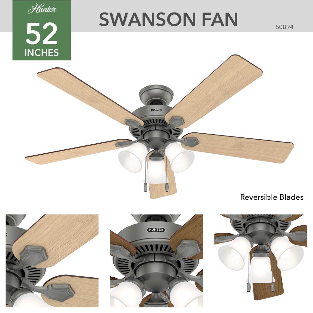 The 52-inch Swanson casual ceiling fan is an ideal fan for large rooms like bedrooms and living rooms. As a part of the Professional Series, the Swanson Collection is available in a variety of sizes, finishes, and light kit combinations. You can add this Hunter ceiling fan to every room in your home knowing it?s wobble free, whisper quiet, and long lasting.