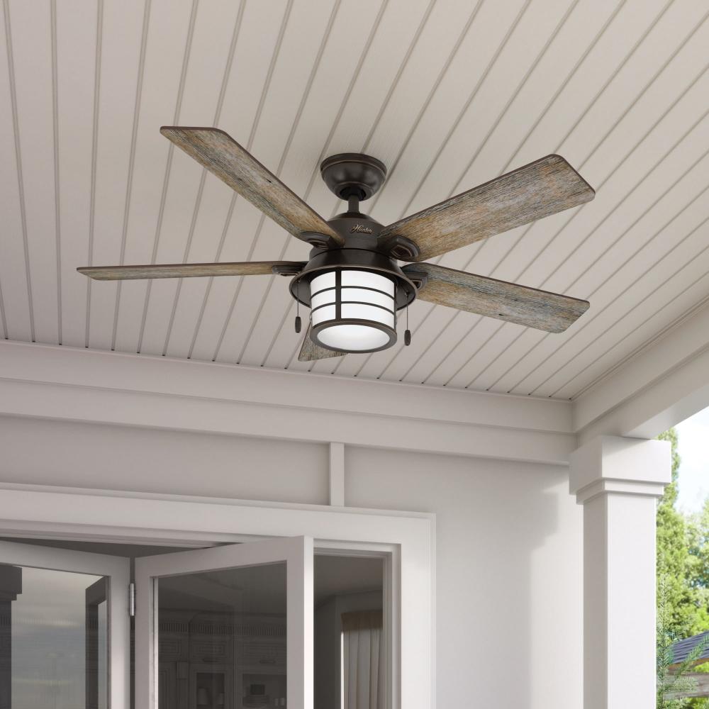 Outfitted with a blade finish reminiscent of aged beachwood, rustic weathered finishes and a lantern-style light kit, the Key Biscayne brings a touch of the Maritimes to your space. Perfect for any room or covered area exposed to moisture and humidity, this damp-rated fan includes stainless steel hardware and will fit nicely in your large, outdoor sunroom or patio's beach house decor. The Key Biscayne features reversible blades powered by a three-speed WhisperWind? motor to deliver ultra-powerful air movement with whisper-quiet performance.
