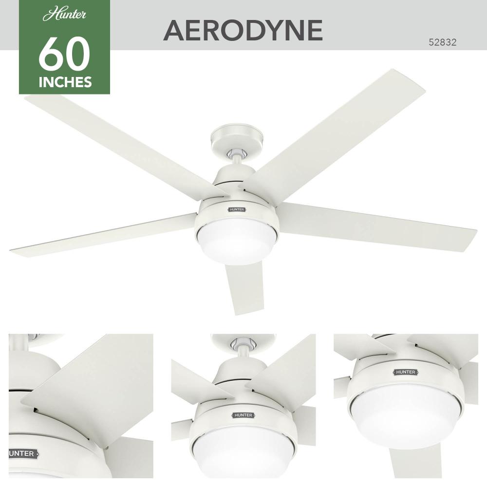 The 60 inch Aerodyne ceiling fan, ENERGY STAR® certified for efficiency, seamlessly integrates with smart home devices like Apple HomeKit, Google Home, and Amazon Alexa through HunterSMART™, formerly known as SIMPLEconnect®, Wi-Fi. It combines sleek design with advanced functionality, featuring a reversible, 6-speed DC motor backed by the SureSpeed® Guarantee for powerful airflow. The installation process is simplified with a pre-installed receiver, while the integrated light kit adds warm ambiance. Control is effortless with the included handheld remote, blending elegance with eco-friendly operation and smart technology.