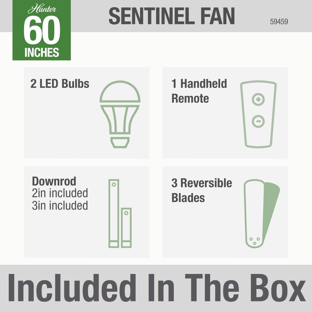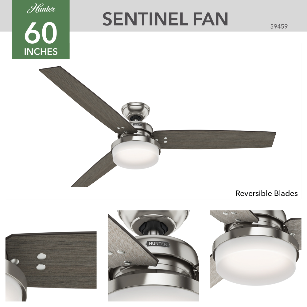 The Sentinel is a casual fan that fits seamlessly into any large, modern space. The simple, clean lines found throughout the design are paired with premium finish combinations to make for a delightful addition to your home decor. The 60-inch blades of this contemporary classic are powered by a reversible, three-speed WhisperWind® motor delivering ultra-powerful air movement with a whisper-quiet performance so you get the cooling power you want without the noise. This modern ceiling fan includes a handheld remote so you can adjust the dimmable, energy-efficient LED lights and three fan speeds.