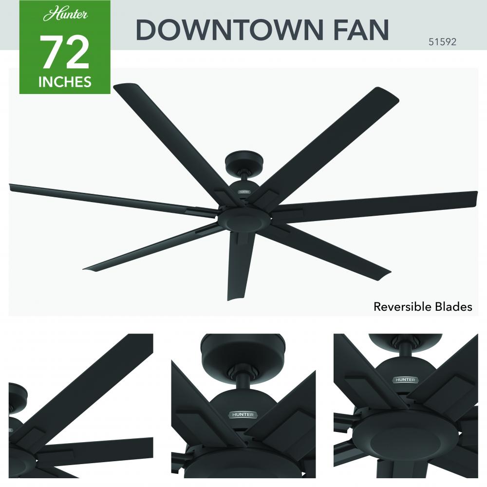 Create a focal point. With its sleek finishes and spanning blades, the 72-inch Downtown ceiling fan commands attention in your large indoor and outdoor spaces. This ceiling fan combines modern and industrial styles to form an unforgettable fixture. Plus, its clean design makes it the perfect addition to all your spaces – regardless of their style.