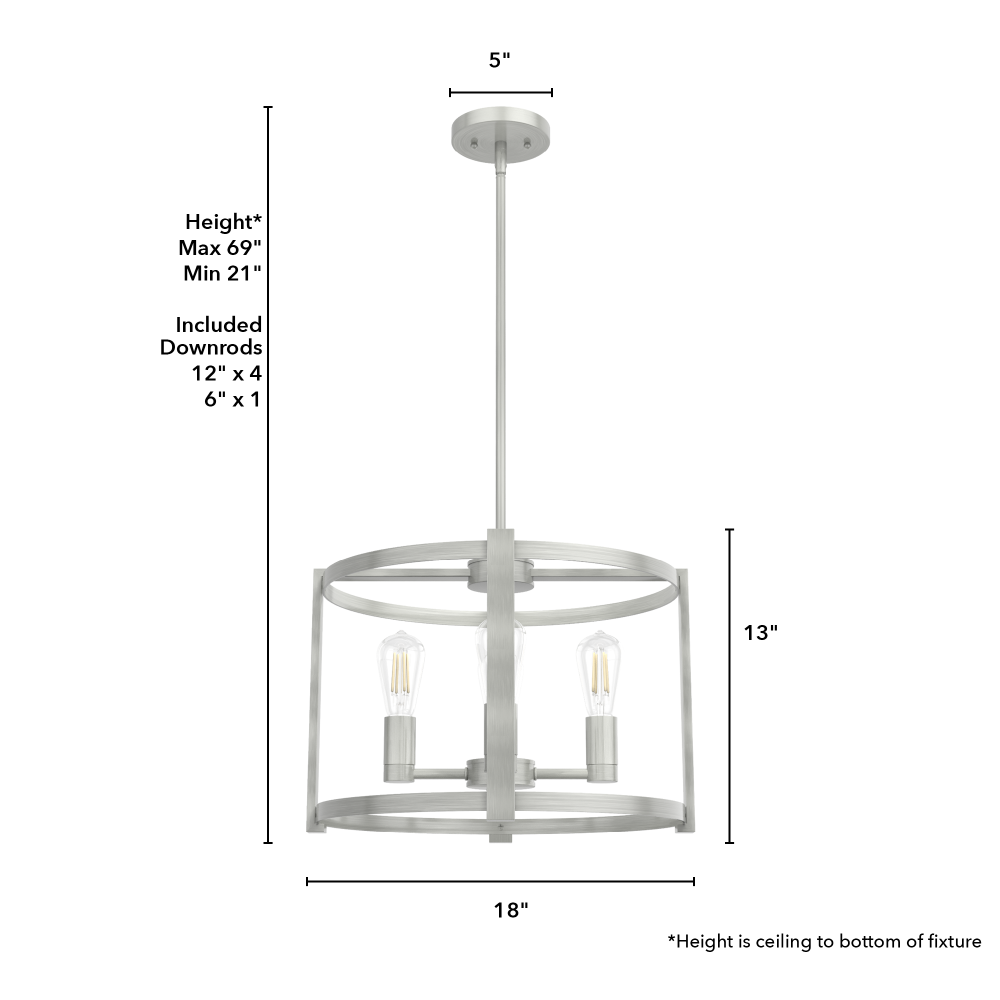 CUSTOMIZABLE HANGING OPTIONS: With the minimum required downrod, the hanging length is 21 inches. When using all of the included downrod, the maximum hanging length is 69 inches.