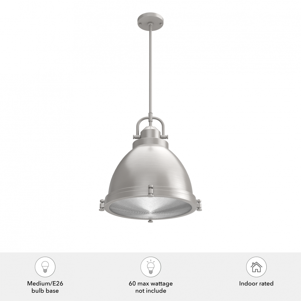 The Bridgemoor oversized pendant light makes an impact. The rustic hardware detailing gives this modern industrial pendant light an authentic and warm aesthetic, perfect for farmhouse style and other casual spaces. With a robust 17-inch diameter and 3 light sockets, this extra-large pendant’s style and light output are industrial sized.