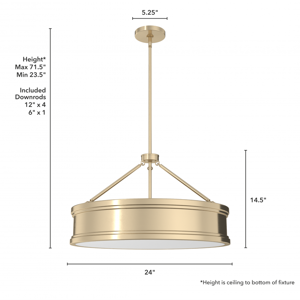 CUSTOMIZABLE HANGING OPTIONS: With the minimum required downrod, the hanging length is 23.5 inches. When using all of the included downrod, the maximum hanging length is 71.5 inches.