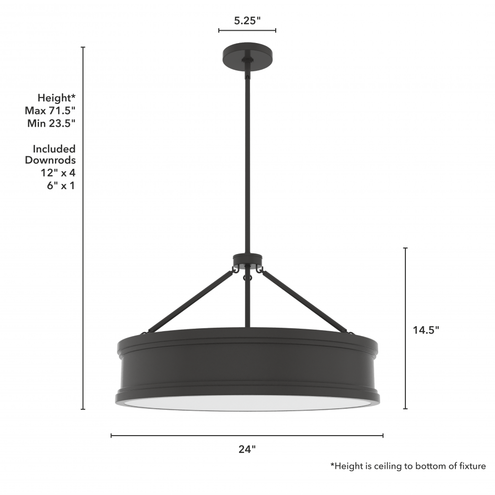 CUSTOMIZABLE HANGING OPTIONS: With the minimum required downrod, the hanging length is 23.5 inches. When using all of the included downrod, the maximum hanging length is 71.5 inches.