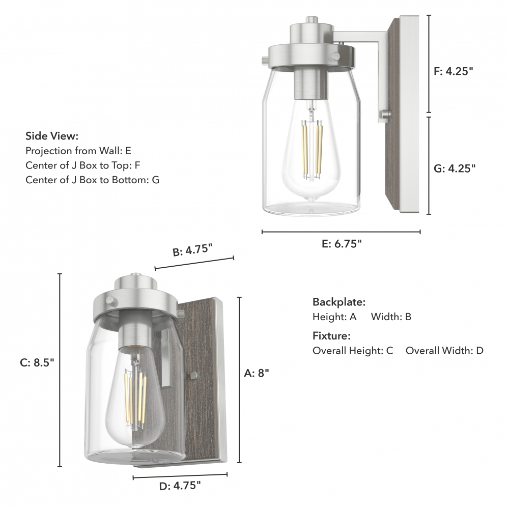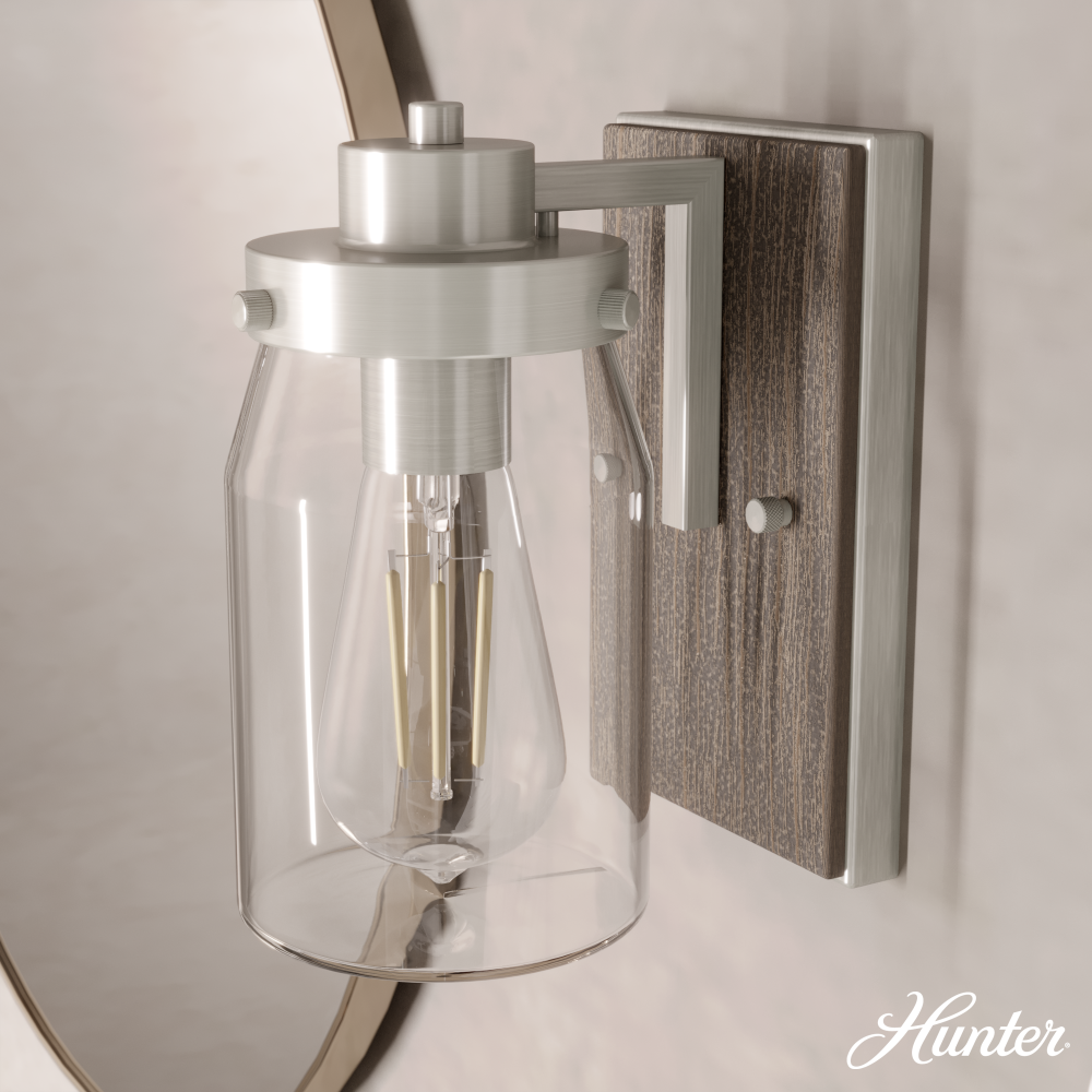 Hunter Devon Park Brushed Nickel and Grey Wood with Clear Glass 1 Light Sconce Wall Light Fixture
