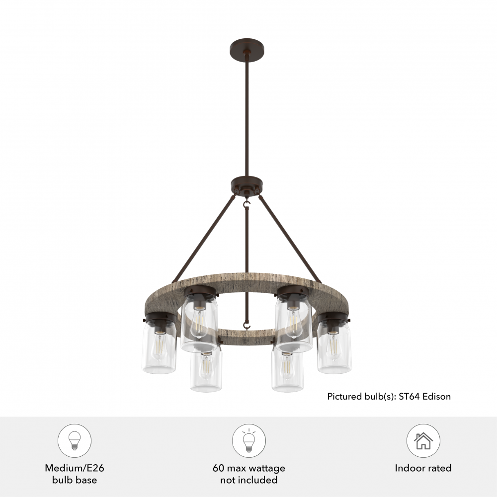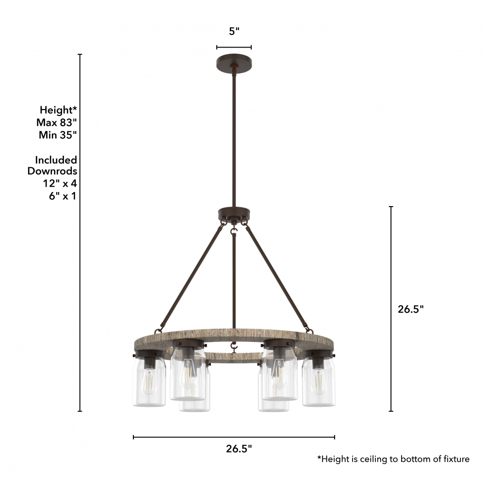 Simply charming, the Devon Park round chandelier’s rustic wood finishes and ball jar inspired glass shades create a look perfect for rustic and farmhouse style spaces. This 6-light chandelier provides opportunity for ample lighting. The warm glow from Edison LED bulbs creates a welcoming ambiance in your space.