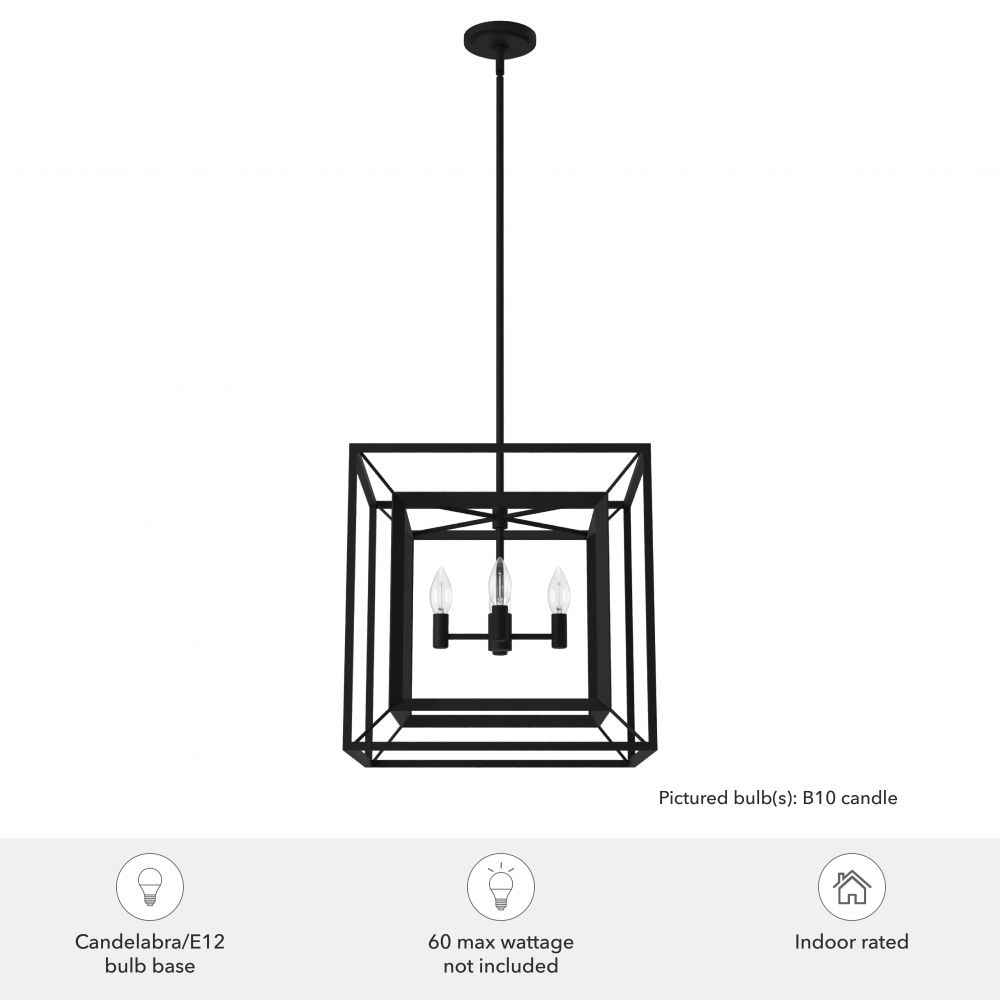 Brighten up your space with a warm glow with the Doherty lantern pendant. A mixture of modern elegance and casual comfort, The Doherty combines bold design, clean lines, and warm illumination of candle-like bulbs that appear to float. This elegant pendant will match seamlessly with your decor. Mix and match with other fixtures from this collection or from our ceiling fan designs.