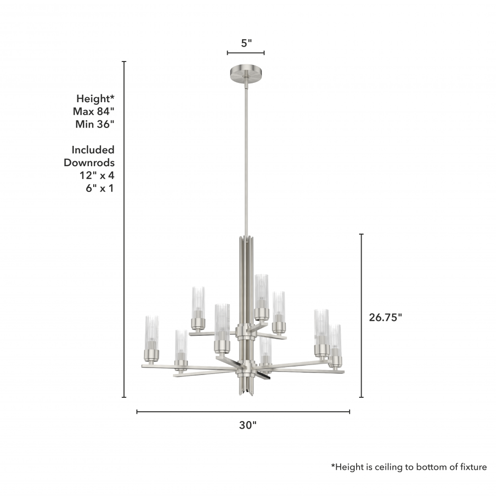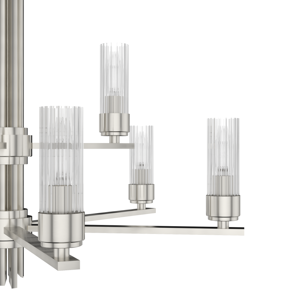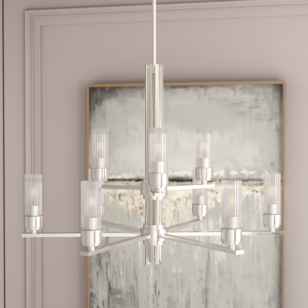 Create a sensation with the flick of a switch. The Gatz 9 light chandelier is the epitome of elegance and glamour. The 9 fluted glass shades and metal finish are lovely by day but stunning at night.