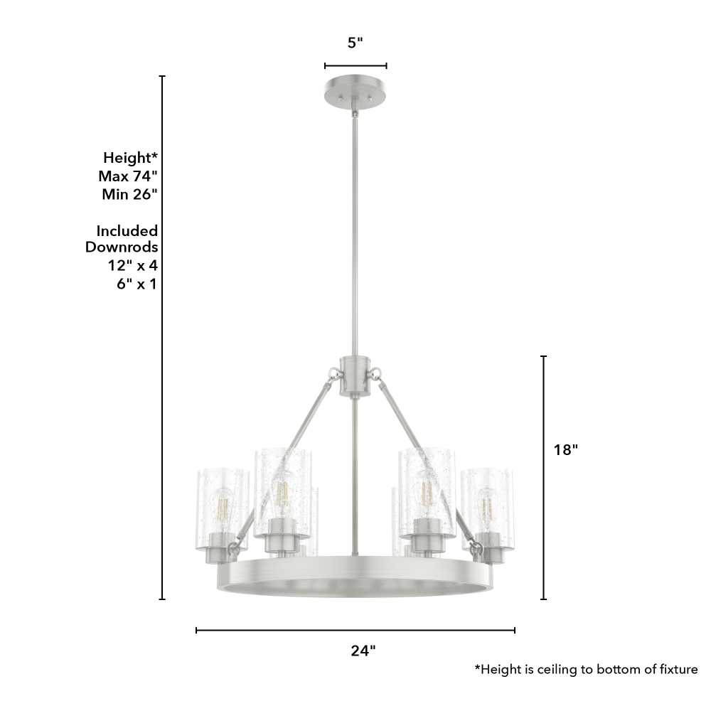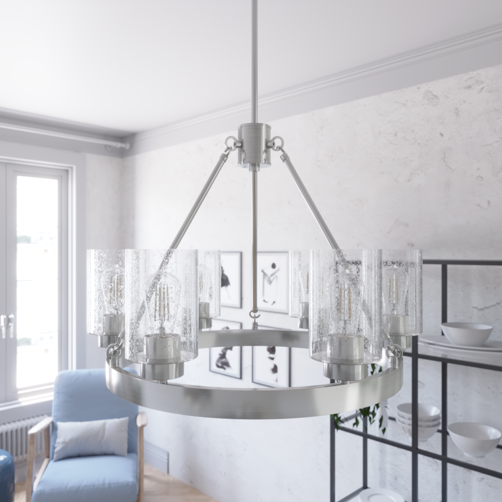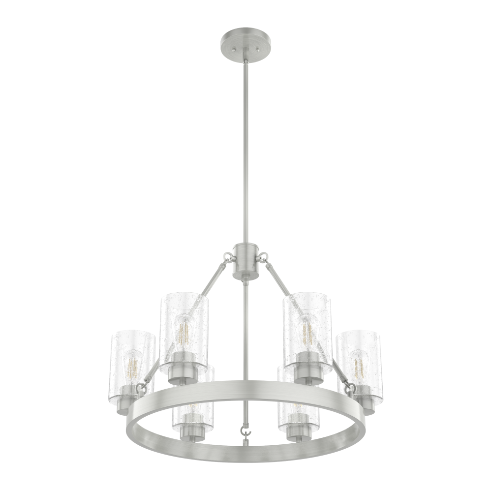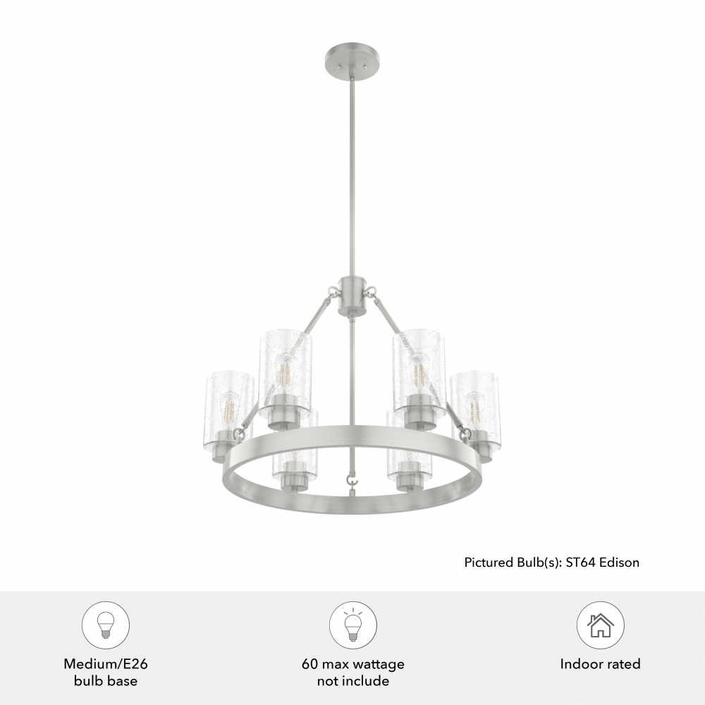 Illuminate your space in stunning fashion with the Hartland. Light reflects from this round chandelier’s seeded glass shades in a striking way, whether from the bulb or sunlight. The Hartland 6-light chandelier delivers a revised classic look that complements a variety of styles and spaces.