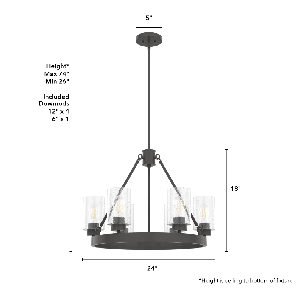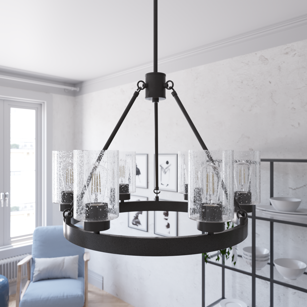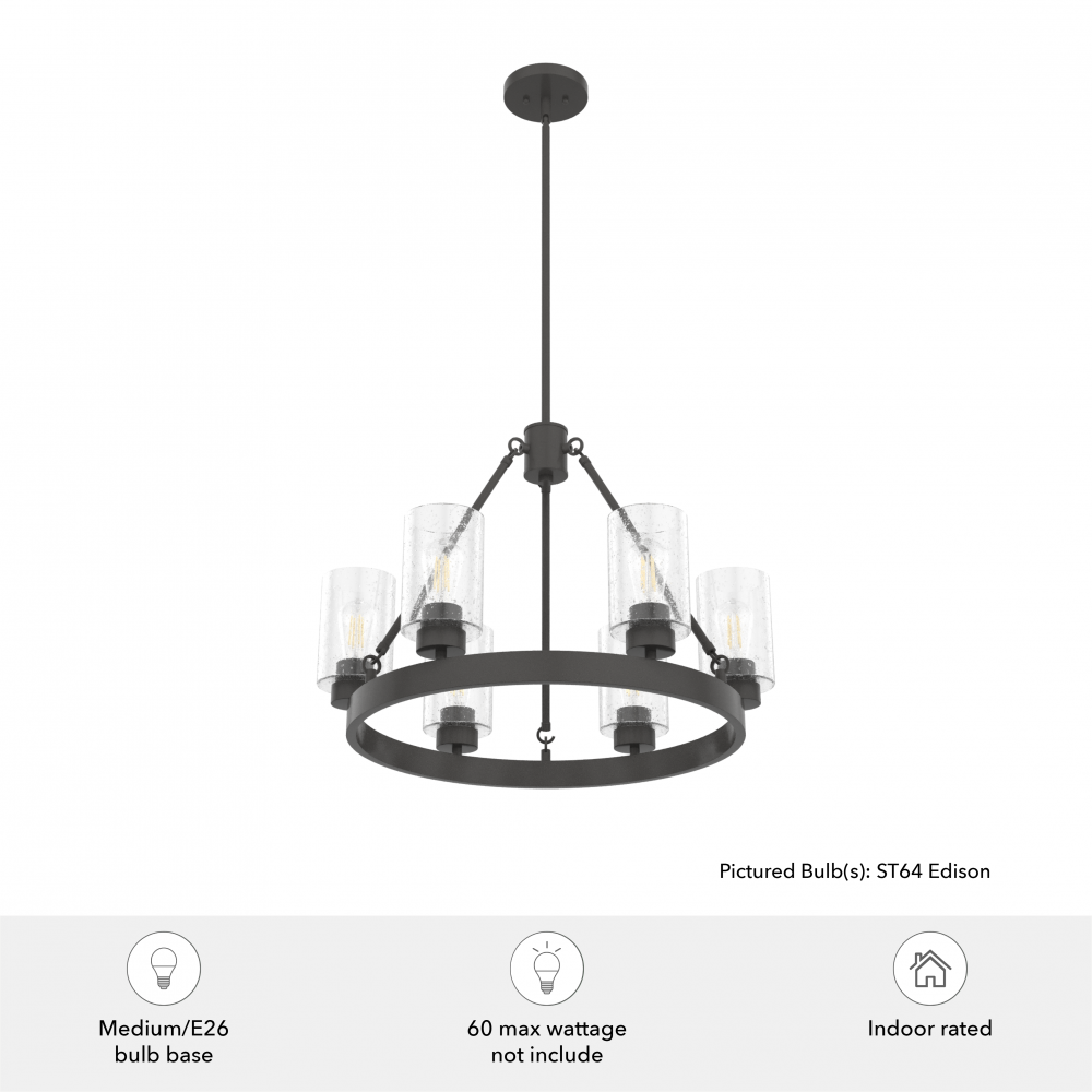 Illuminate your space in stunning fashion with the Hartland. Light reflects from this round chandelier’s seeded glass shades in a striking way, whether from the bulb or sunlight. The Hartland 6-light chandelier delivers a revised classic look that complements a variety of styles and spaces.