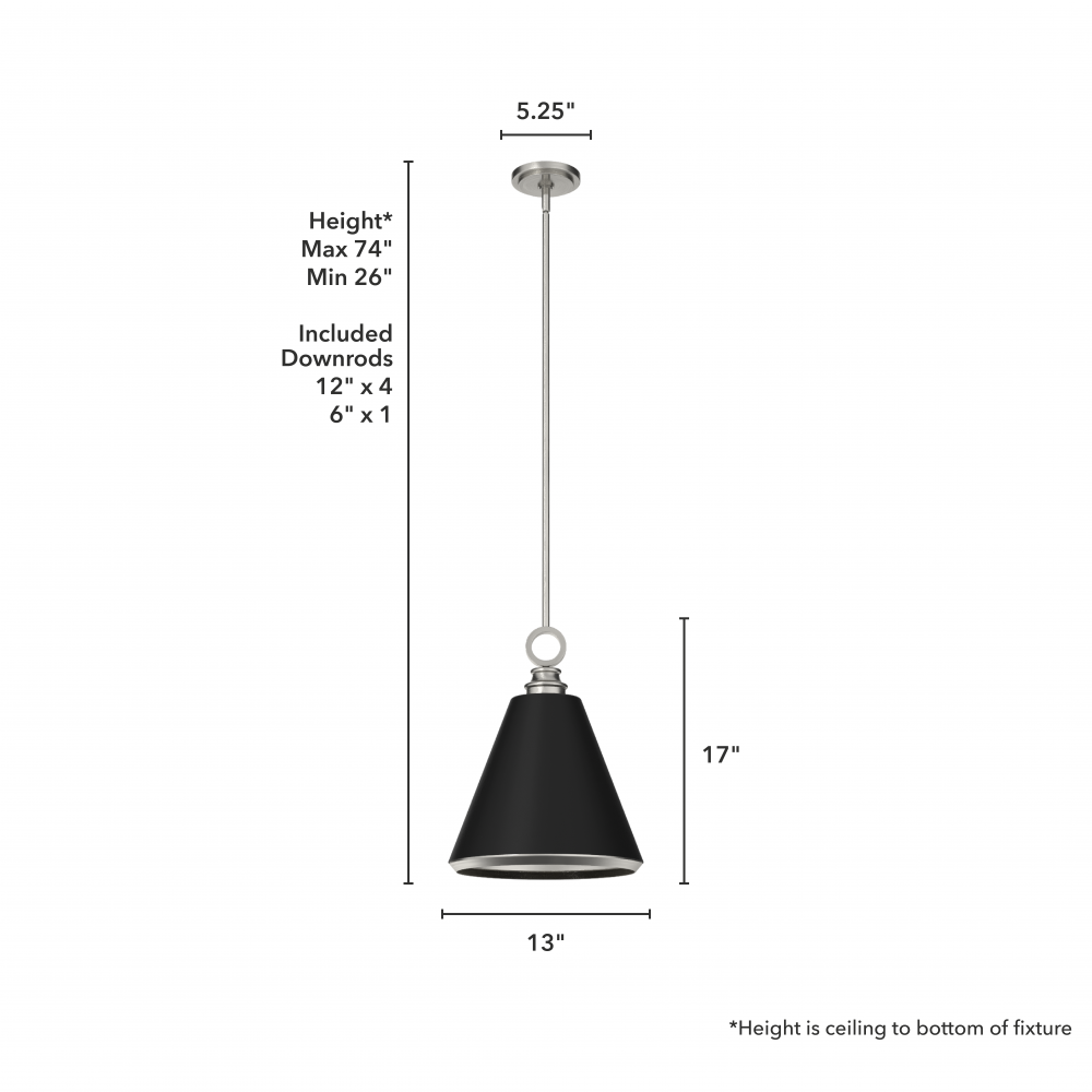 CUSTOMIZABLE HANGING OPTIONS: With the minimum required downrod, the hanging length is 26 inches. When using all of the included downrod, the maximum hanging length is 74 inches.