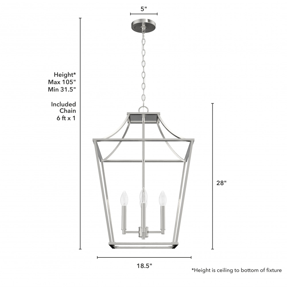 CUSTOMIZABLE HANGING OPTIONS: With the minimum required chain, the hanging length is 31.5 inches. When using all of the included chain, the maximum hanging length is 105 inches.