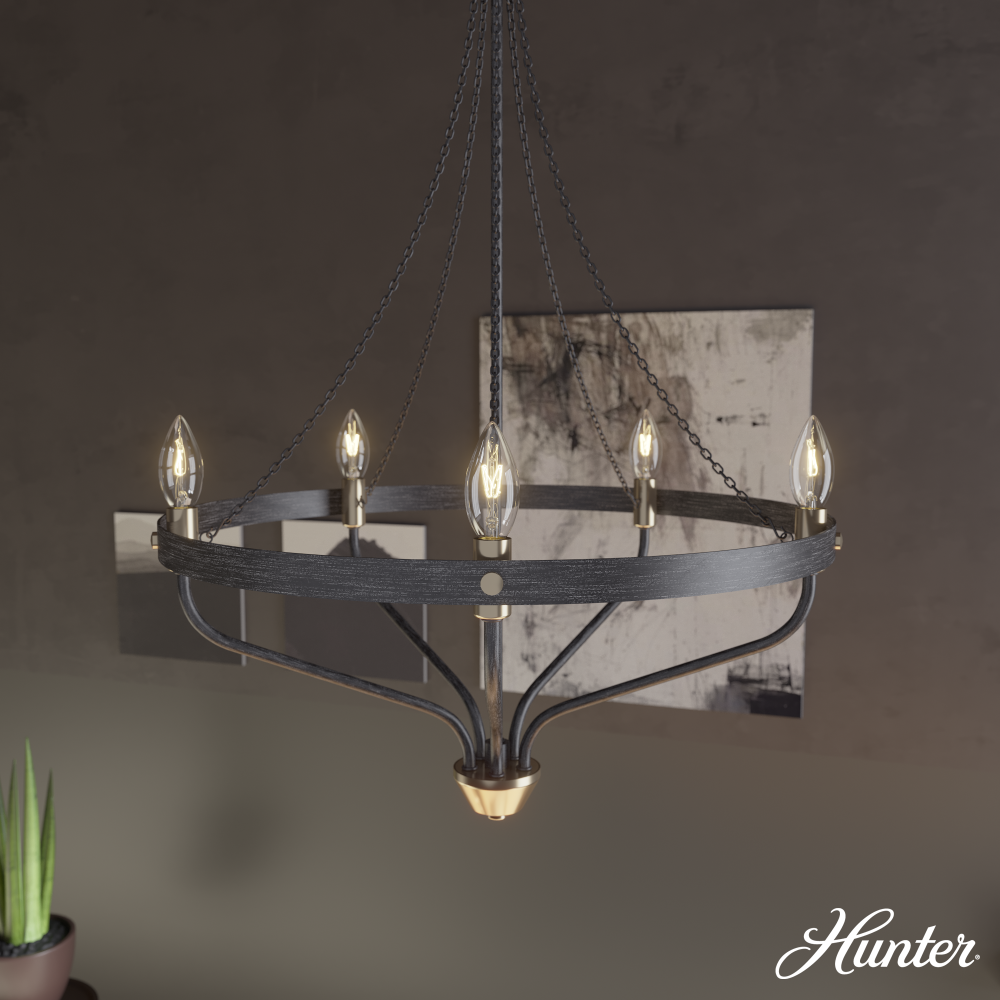 Warmth and wonder converge in Hunter’s chandelier—a showstopping piece from our Merlin collection. A glowing ring of lights evokes a sense of magic and mystery, while the Merlin’s modern angles and clean lines serve to ground the fixture in contemporary style. Available in multiple finishes, the Merlin chandelier is a mesmerizing addition to your design scheme. Mix and match with other fixtures from this collection or from our ceiling fan designs.