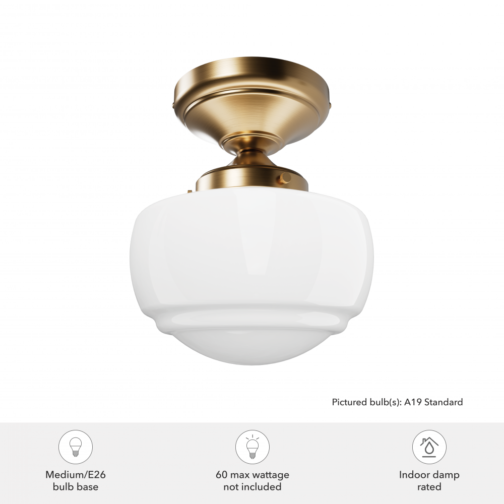Iconic style, reimagined. Inspired by the classic American schoolhouse light, the Saddle Creek semi-flush mount combines simple design elements to create a subtly sophisticated style. Available in cased white or clear seeded glass, the Saddle Creek’s semi-flush mount makes this fixture an ideal choice for smaller spaces or rooms with low ceilings. Mix and match with other fixtures from this collection or from our ceiling fan designs.