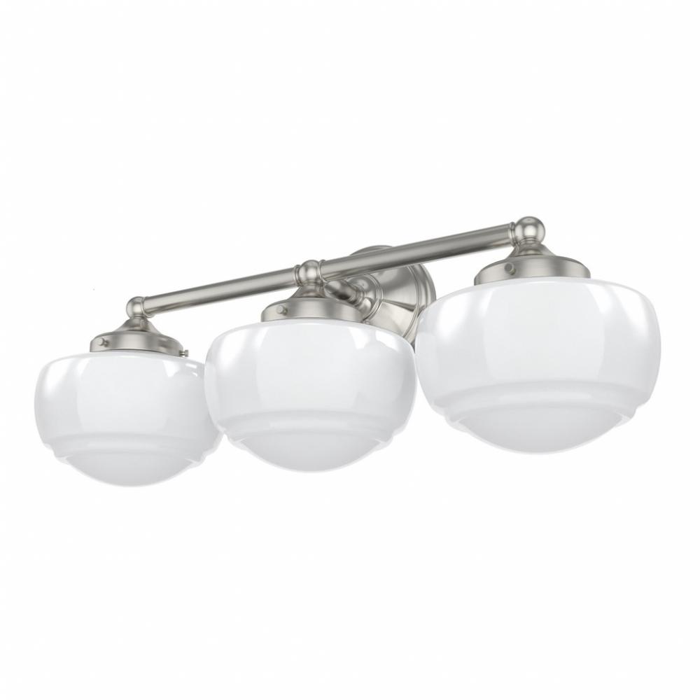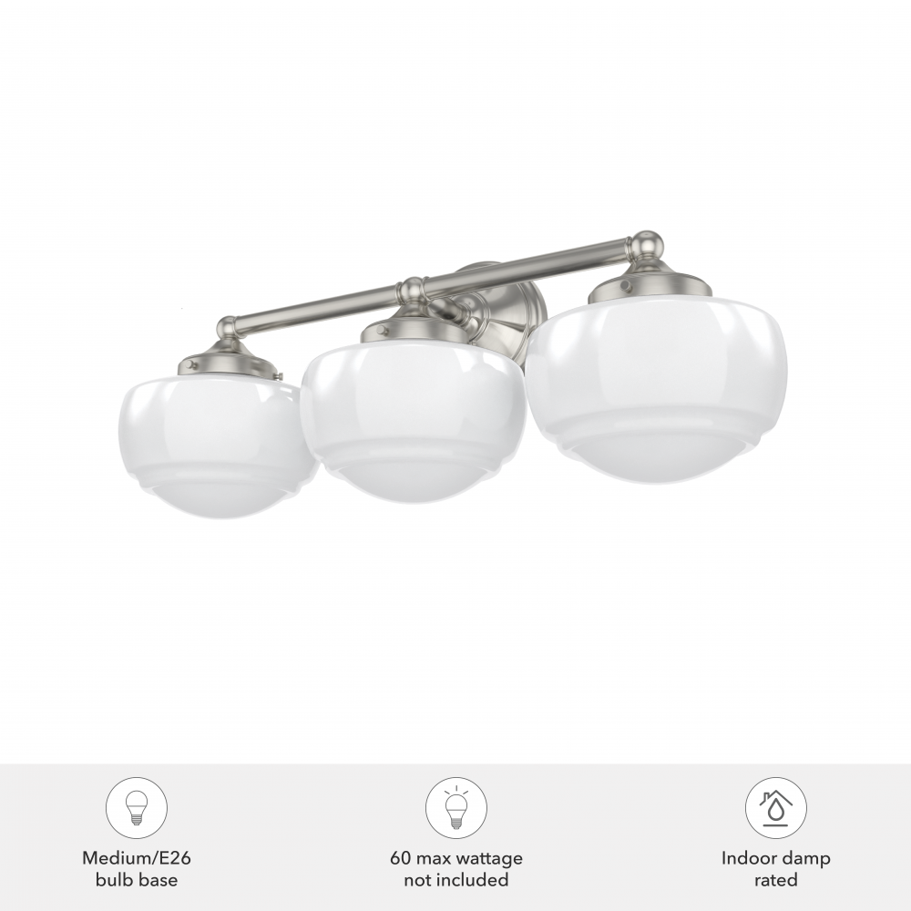 Introduce a vintage element to your vanity with the Saddle Creek fixture, inspired by the iconic American schoolhouse light. This vanity lighting will reflect a warm glow that illuminates subtle detailing within the glass. The Saddle Creek’s simple metal finish and fittings lend a subtlety to the light’s sophisticated style. Mix and match with other fixtures from this collection or from our ceiling fan designs.