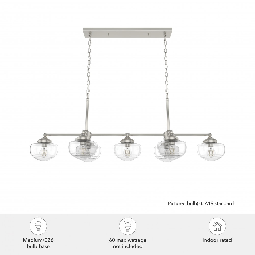 With its modern take on schoolhouse style, the Saddle Creek linear chandelier might be the perfect fixture for your home’s dining room or kitchen. Artfully arranged glass globes offset the chandelier’s simple metal finish, creating a piece elegant enough to accent a formal dining room yet casual enough for a kitchen island. The Saddle Creek offers a fresh look at a classic design.