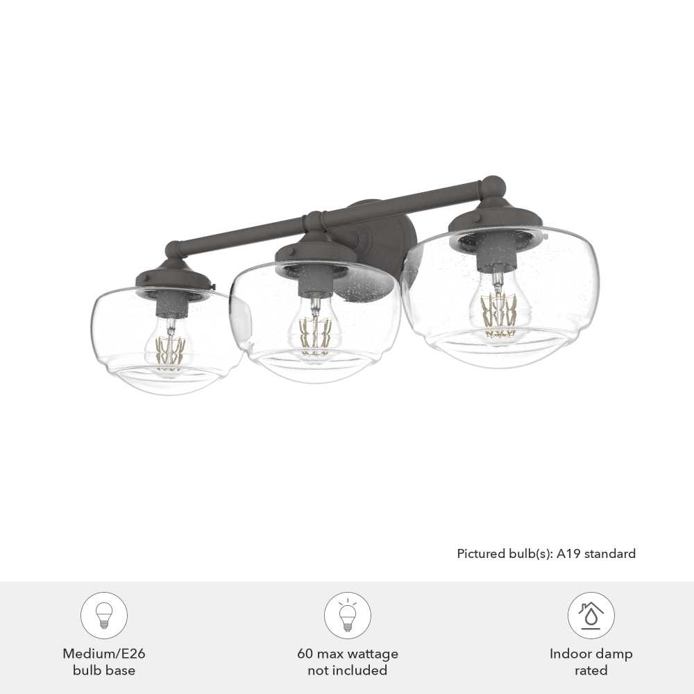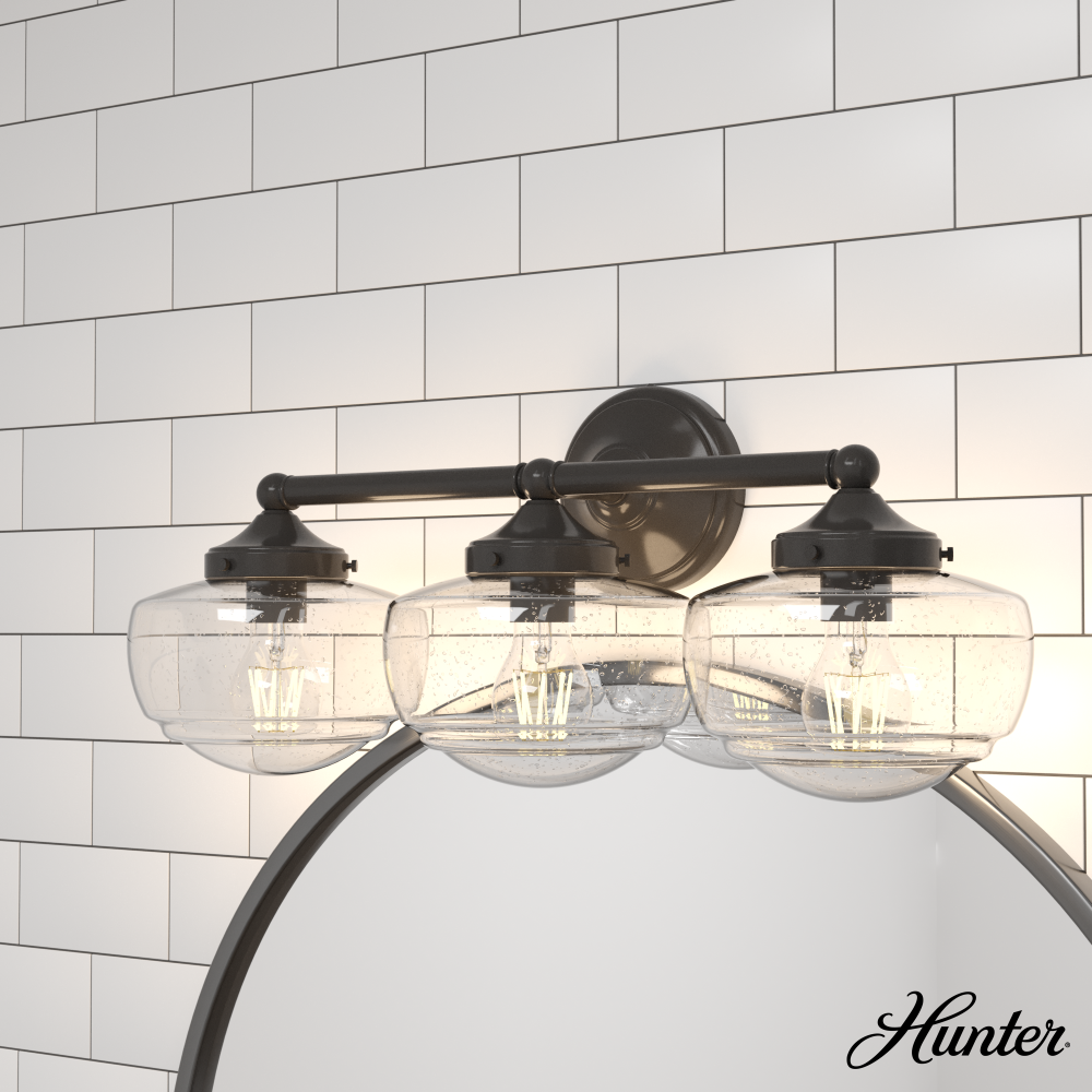 Introduce a vintage element to your vanity with the Saddle Creek fixture, inspired by the iconic American schoolhouse light. This vanity lighting will reflect a warm glow that illuminates subtle detailing within the glass. The Saddle Creek’s simple metal finish and fittings lend a subtlety to the light’s sophisticated style. Mix and match with other fixtures from this collection or from our ceiling fan designs.