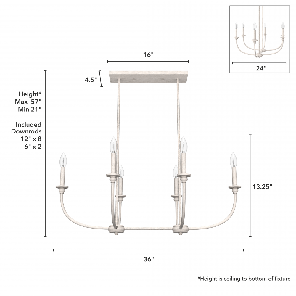CUSTOMIZABLE HANGING OPTIONS: With the minimum required downrod, the hanging length is 21 inches. When using all of the included downrod, the maximum hanging length is 57 inches.