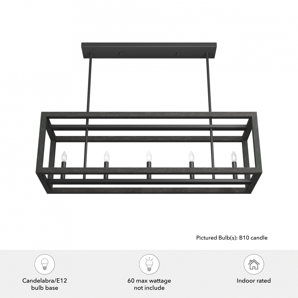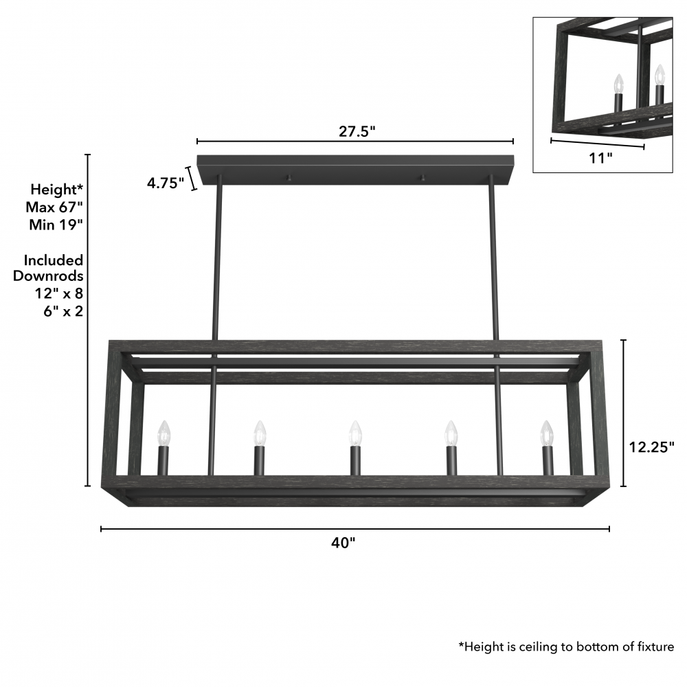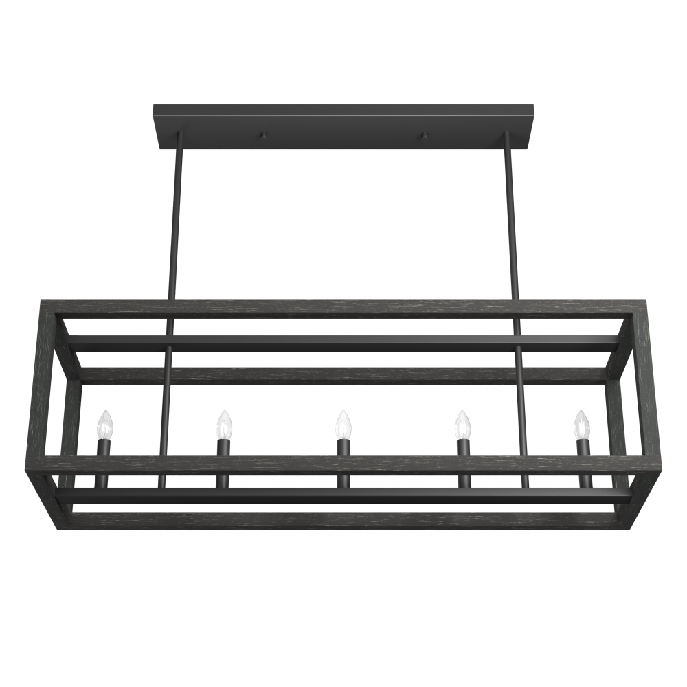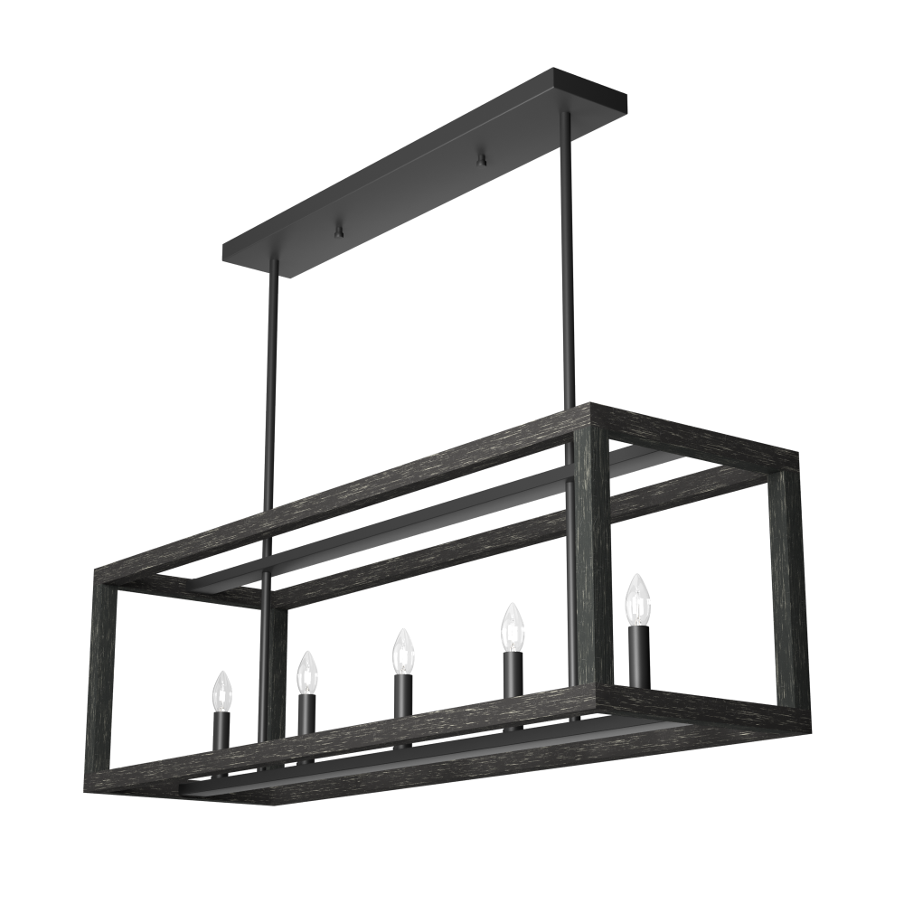 The openness of the Squire Manor linear chandelier coupled with the clean lines and wood inspired texture gives it an airy and warm aesthetic. With a simple form and subtle wood grain detailing, this lantern-inspired light feels at home in any setting, from farmhouse to Mid-Century modern.