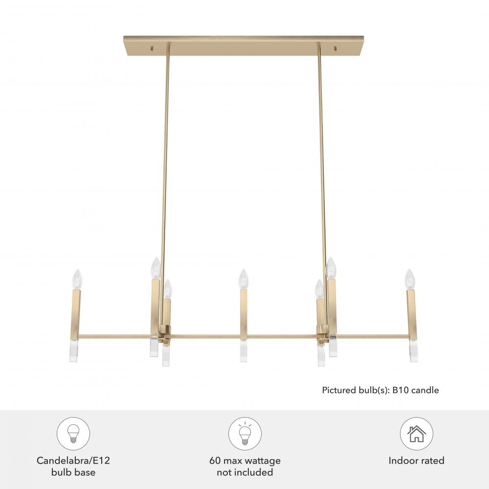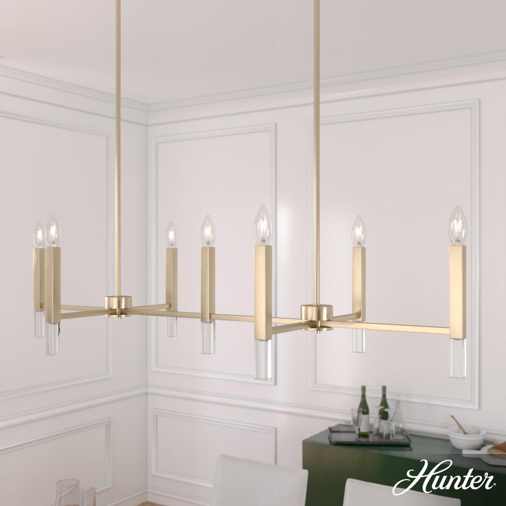 Gathering under the glow of the Sunjai linear chandelier will turn your dinner into a party. Laugh and dine under this beautiful modern fixture perfect for kitchens and dining rooms. This chandelier is modern and meets glamourous with geometric adornments set into the clean-lined metal candles to add a touch of sparkle that will compliment any decor. Mix and match with other fixtures from this collection or from our ceiling fan designs.