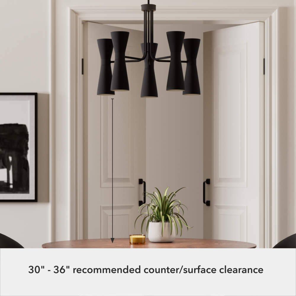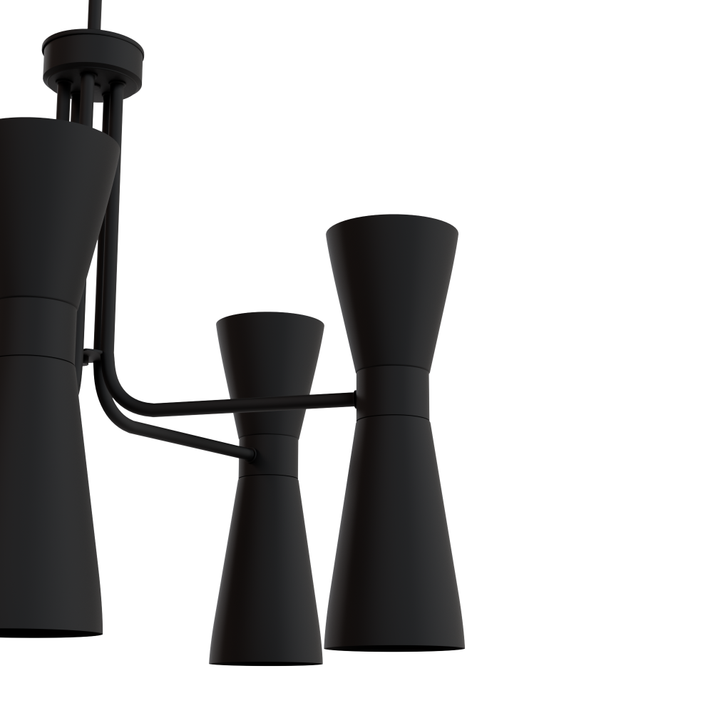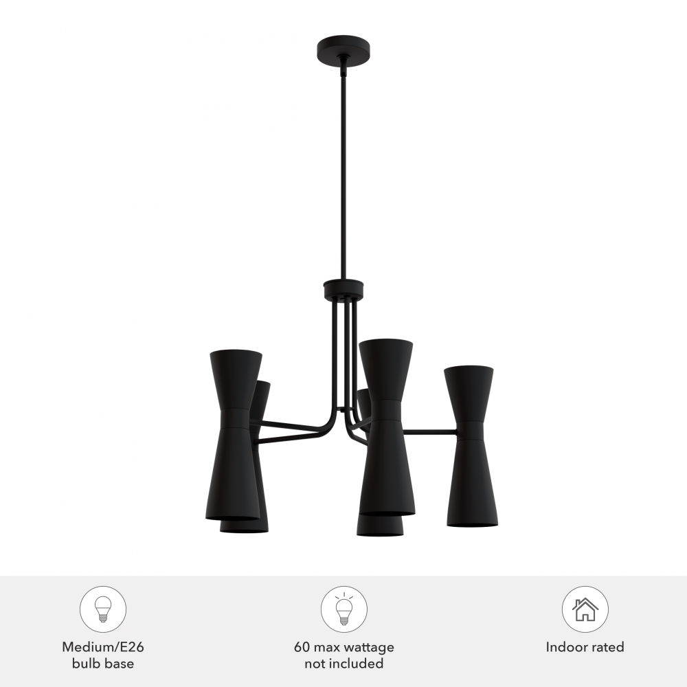 Designed in collaboration with Jasmine Roth and exuding mid-century modern charm, the Zola Chandelier captivates with its distinctive, sculptural silhouette. Boasting a pharmacy head metal shade, this stunning chandelier is destined to be the centerpiece of your next dinner party. The elegant black finish strikes a harmonious balance between subtle beauty and a commanding focal point for your dining room, living room, or bedroom. Effortlessly integrate this striking chandelier with other fixtures from the Jasmine Roth Collection.