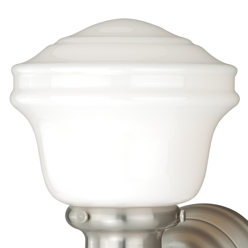 The Huntley is a timeless collection inspired by mid-century small-town aesthetics. The vintage school house glass is the focal point of this design : with its unique profile and glass options. Offered in two finishes, this versatile wall light will provide a unique accent to a variety of kitchen, dining, and bathroom settings. Medium screw base lamping provides maximum light output. Mountable in up light or down light configuration. The complete collection includes Medium Size Pendants, Semi-Flush, and 1, 2 3, and 4 Light vanities.