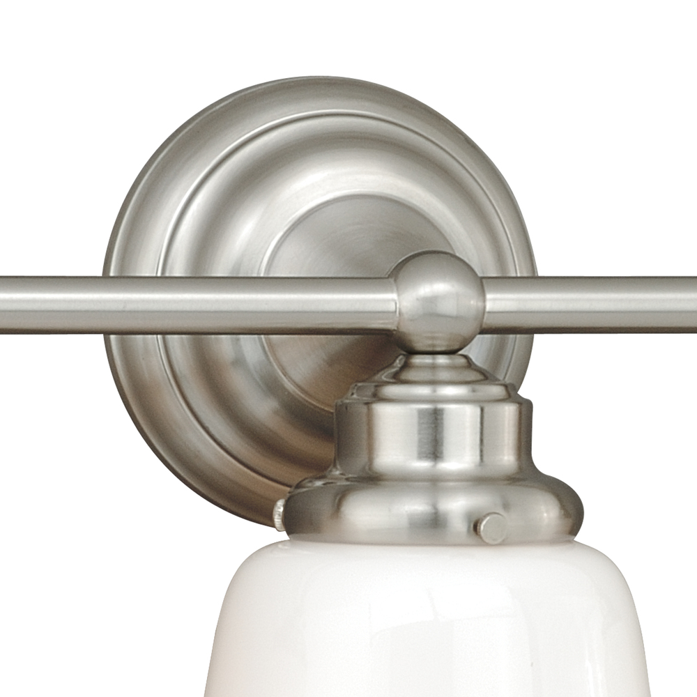 The Huntley is a timeless collection inspired by mid-century small-town aesthetics. The vintage school house glass is the focal point of this design : with its unique profile and glass options. Offered in two finishes, this versatile wall light will provide a unique accent to a variety of kitchen, dining, and bathroom settings. Medium screw base lamping provides maximum light output. Mountable in up light or down light configuration. The complete collection includes Medium Size Pendants, Semi-Flush, and 1, 2 3, and 4 Light vanities.