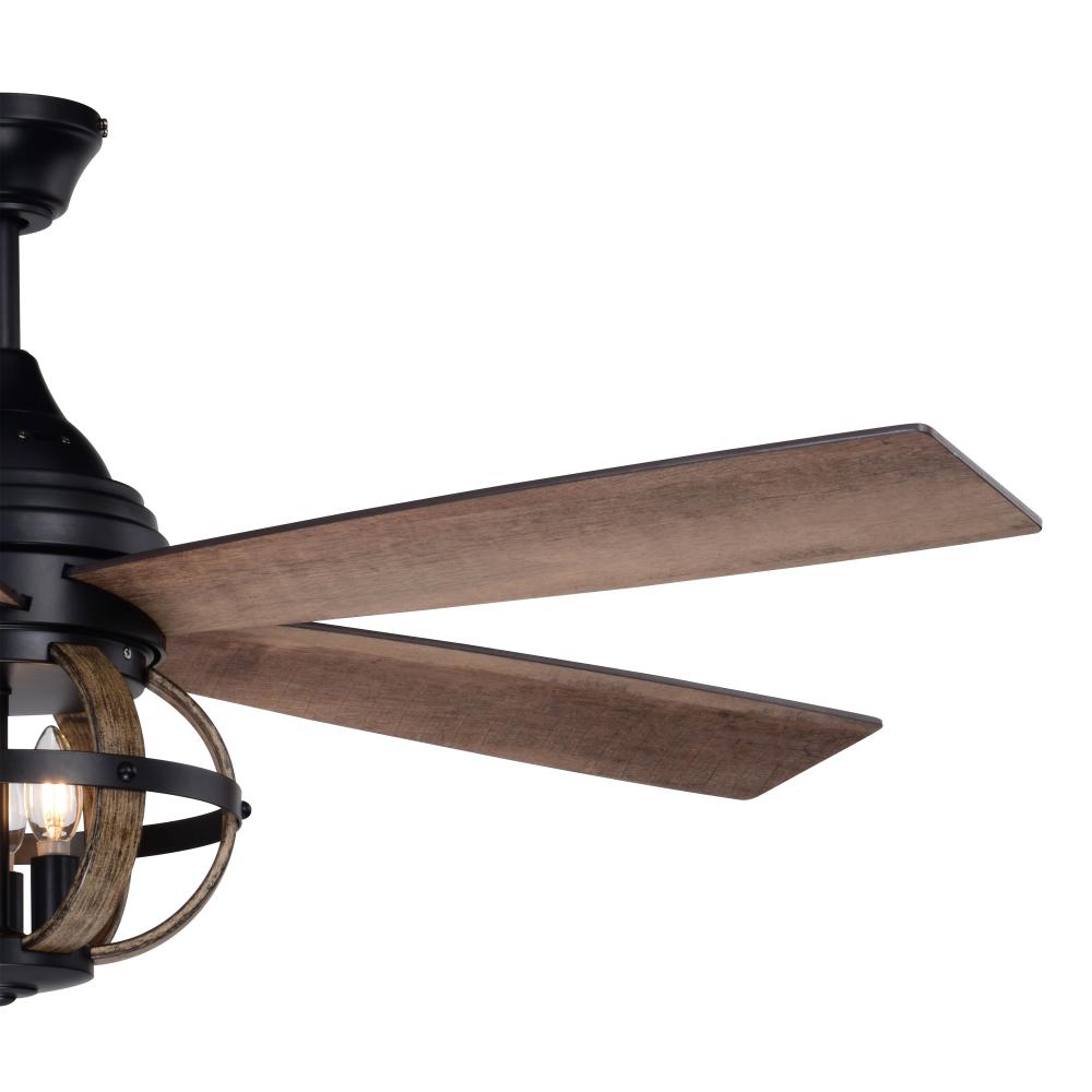 Modern farmhouse charm is exemplified in the Huron collection. Black and burnished teak finishes strongly accentuates the round caged light kit with painted wood accents. The fan blades are reversible with either black walnut or burnished teak finishes. Dimmable LED bulbs and a 3-speed remote control are included. This fan is compatible with sloped ceilings and includes a 6 inch downrod (longer down rods sold separately). Ideal for bedroom, kitchen, family room, or other interior living area of your home.