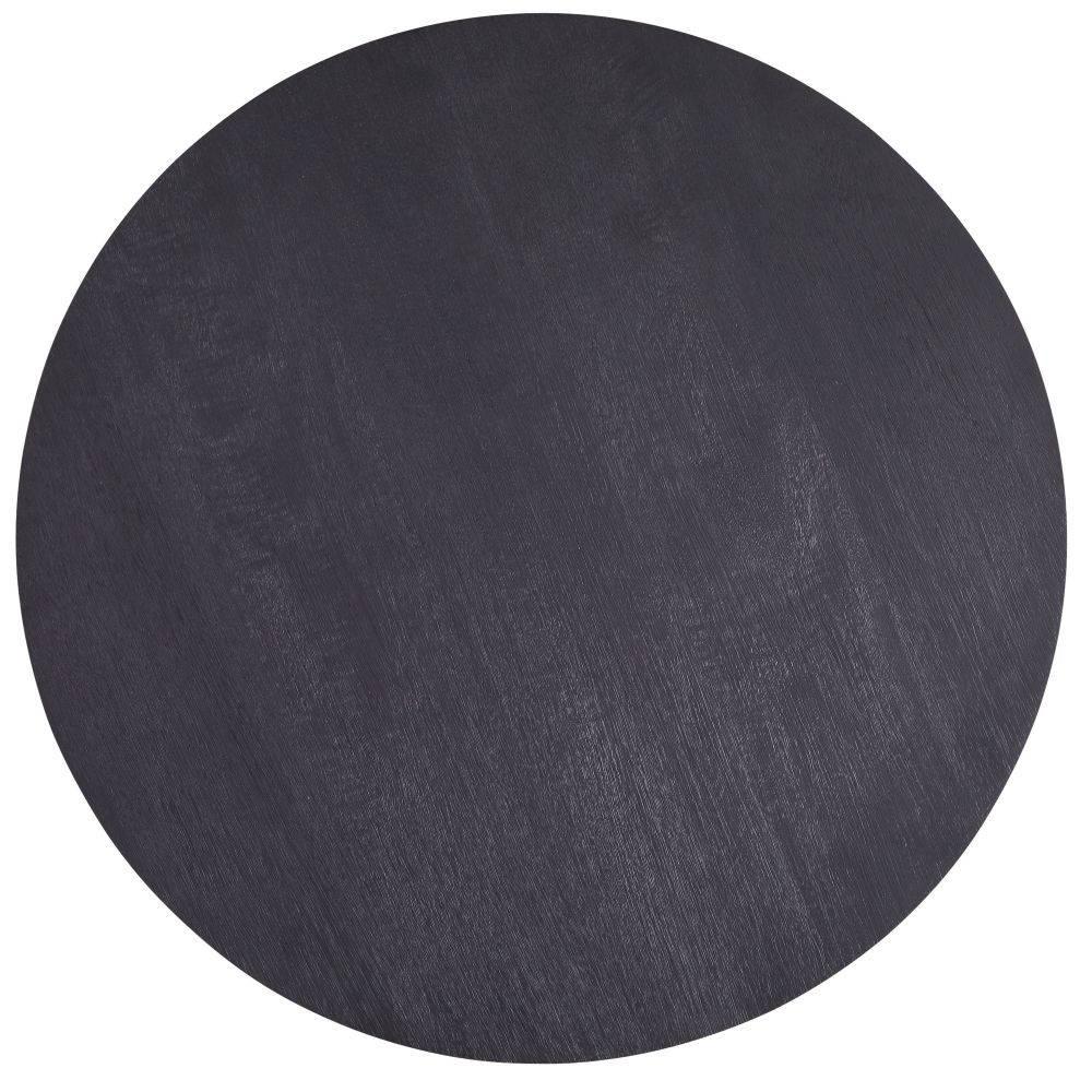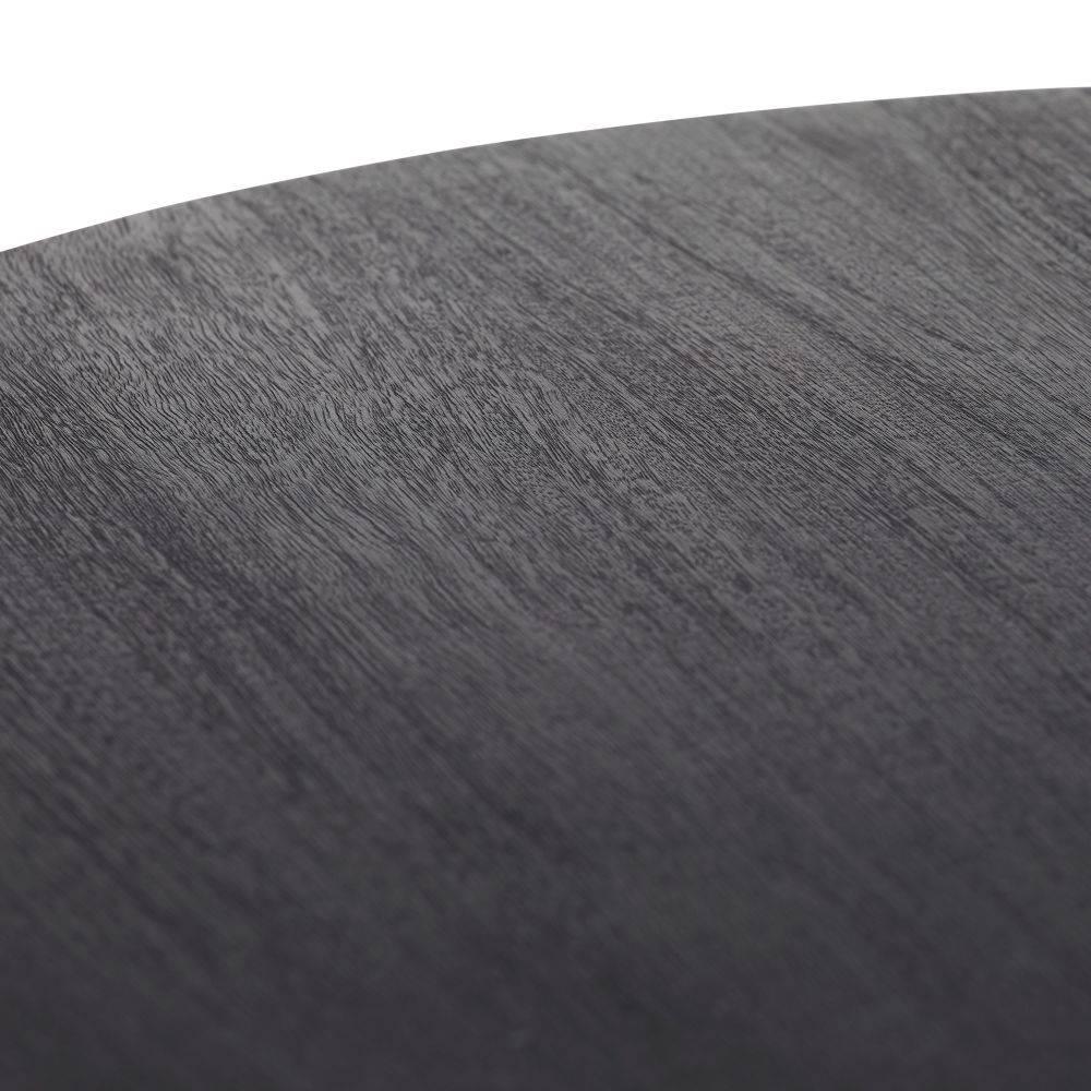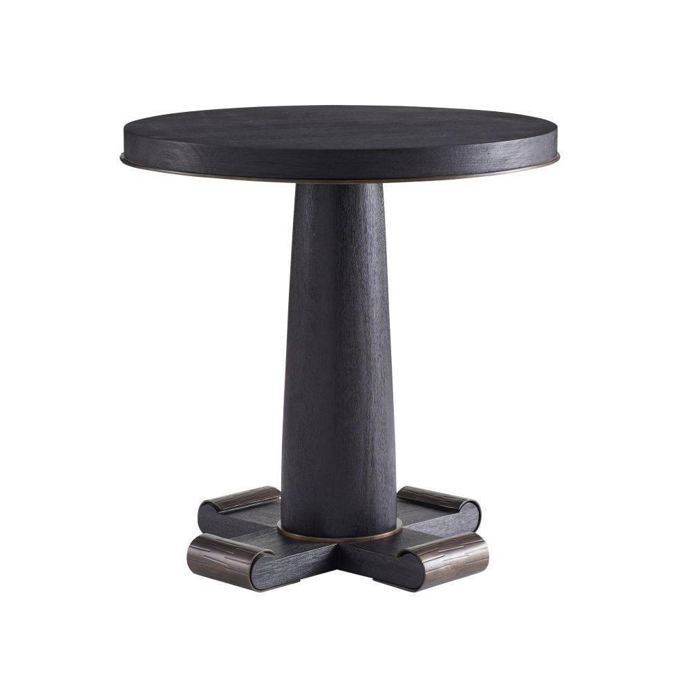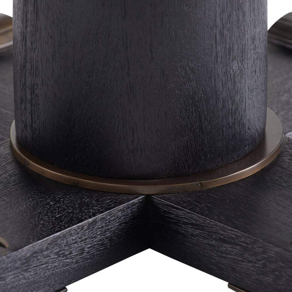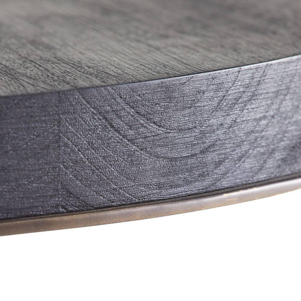 An update of an Empire-style classic, ebony mango wood is dressed up with rolled metal cuffs of bronze iron highlighting the top and cross pedestal base. This subtly textured style is overscaled for large living areas. Wood will vary.