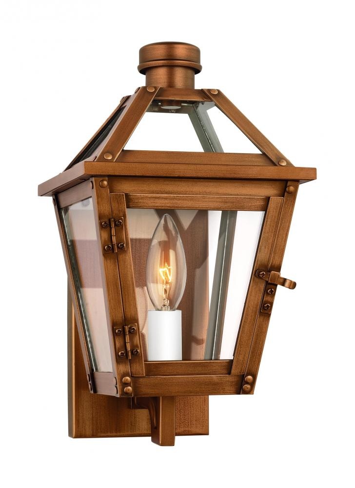 The Hyannis one light outdoor wall fixture by Chapman & Myers has a classic copper lantern profile with top and bottom glass panels. Assembled with an overlapping metal frame which is accented by rivet details. Each light has a historically inspired spun metal chimney cap. The sconces are supported by a traditional bent metal architectural bracket.