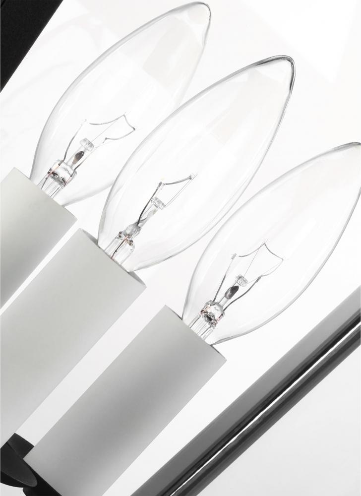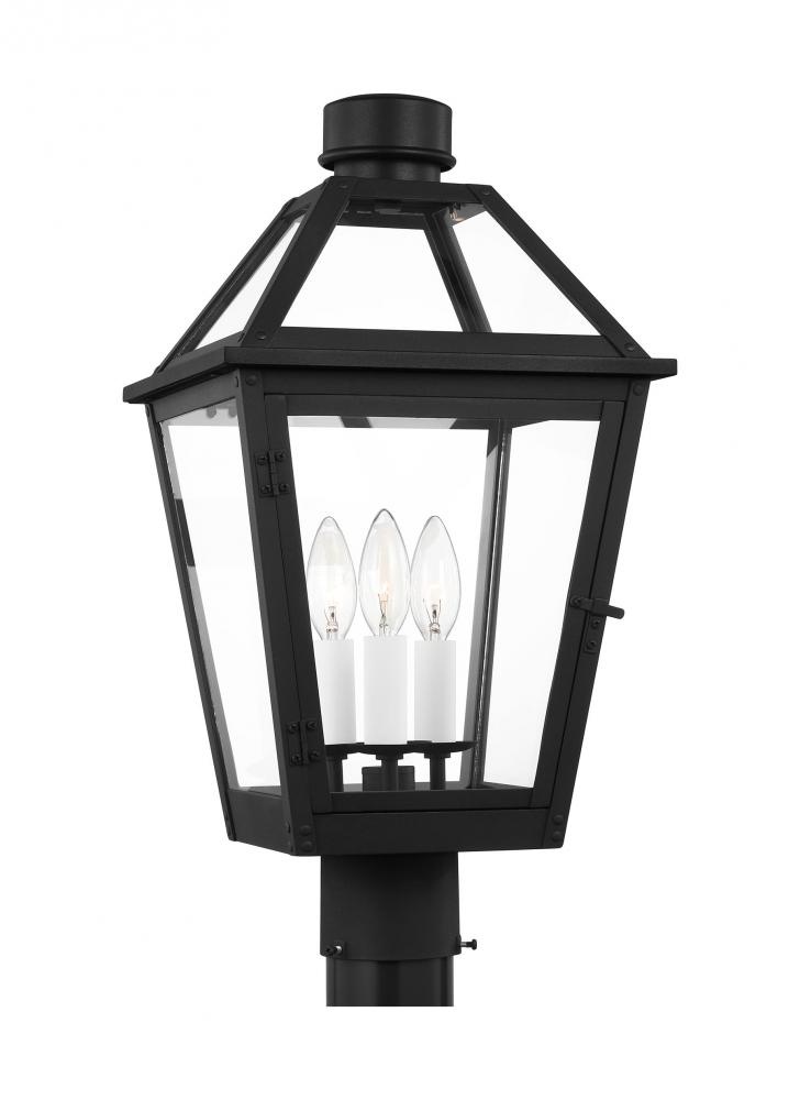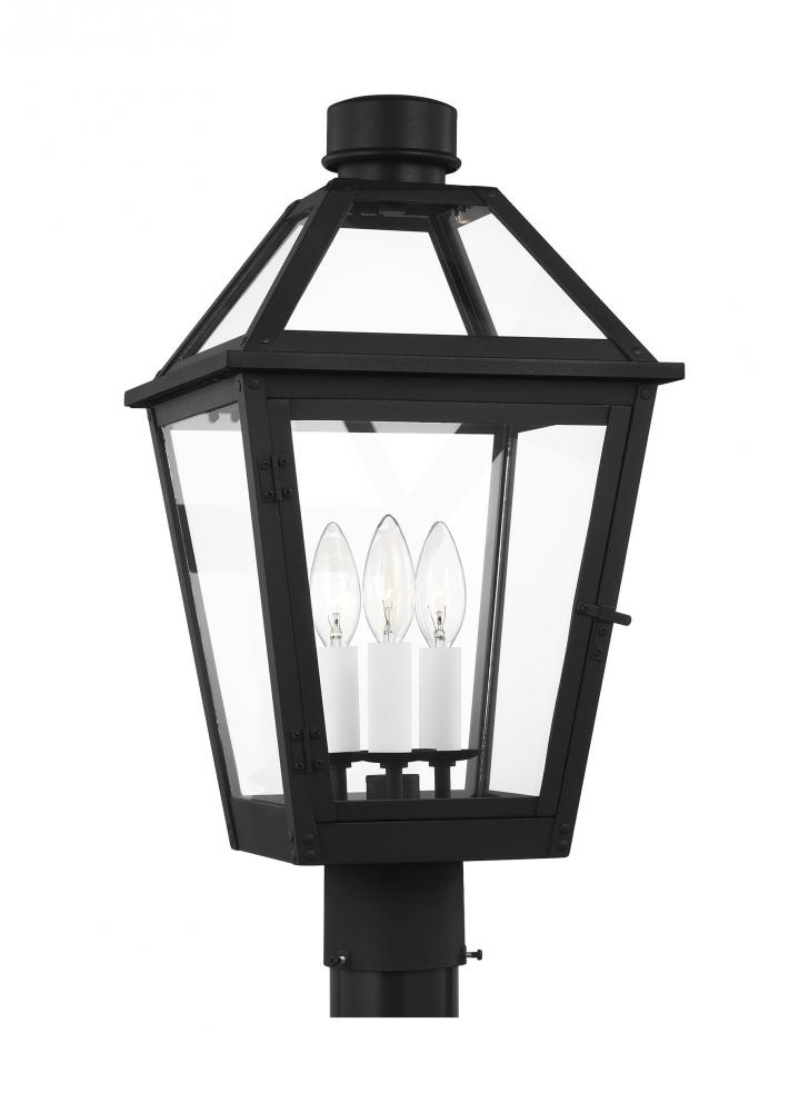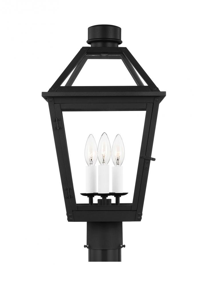The Hyannis three light outdoor post top in textured black by Chapman & Myers has a classic copper lantern profile with top and bottom glass panels. Assembled with an overlapping metal frame which is accented by rivet details. Each light has a historically inspired spun metal chimney cap. The sconces are supported by a traditional bent metal architectural bracket.