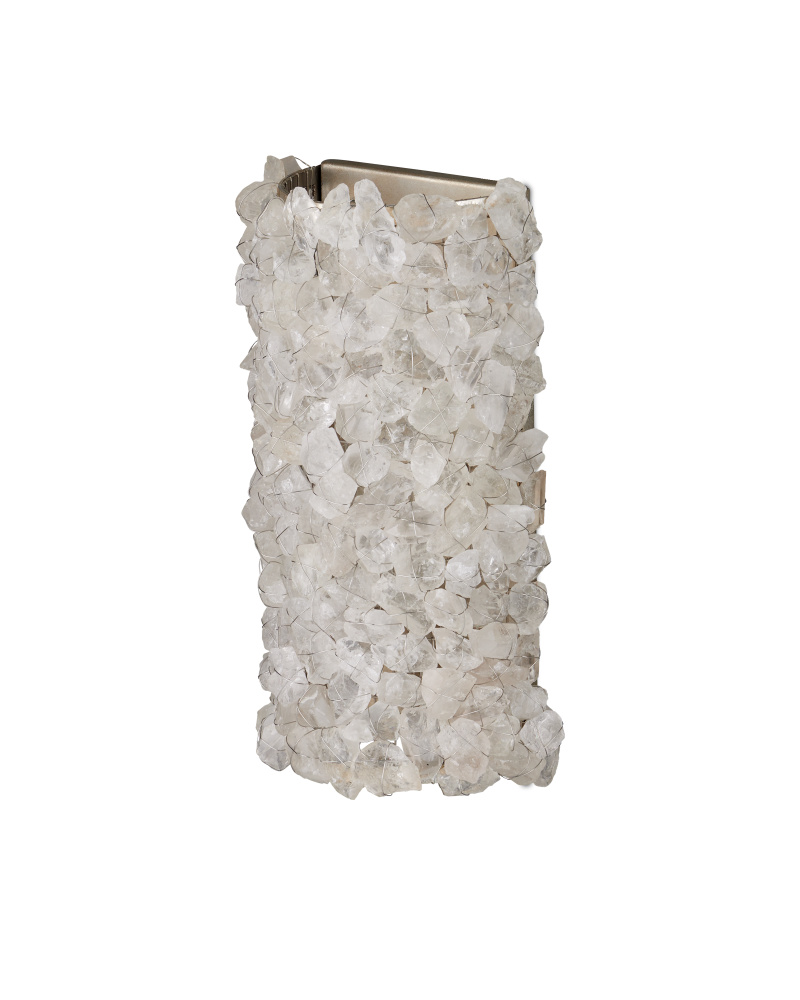 The Iconoclast Wall Sconce is a sparkling beauty with natural rock crystal affixed to a sturdy wrought iron frame in a contemporary silver leaf finish. Designed with attention to detail, the white wall sconce features rock crystals attached with very thin wire, creating visual interest without interfering with the luminosity of the stones. The pieces of pale material filter the light in the same way ice might, enhancing the beauty of this fixture.